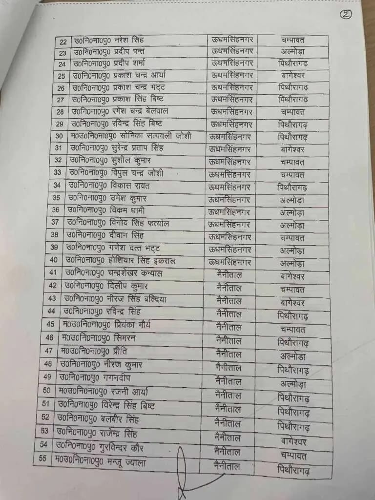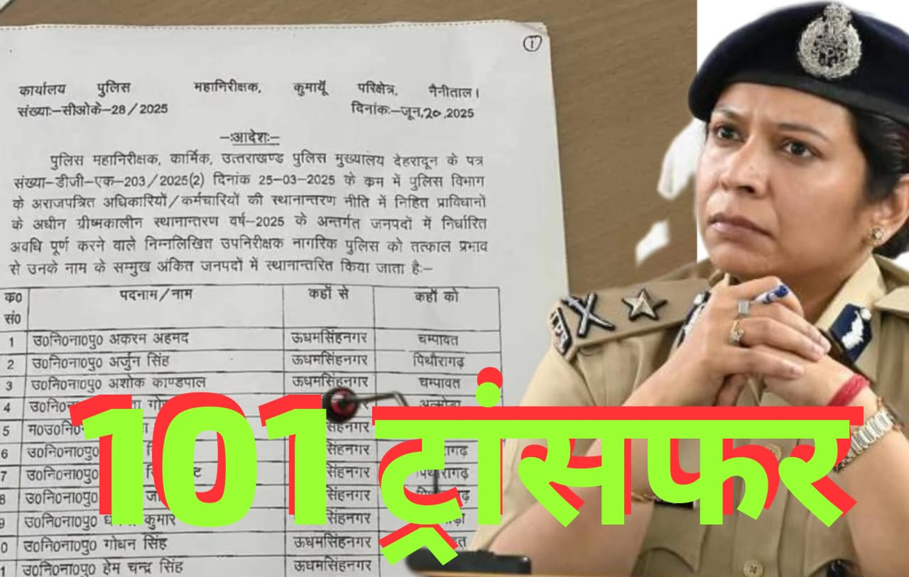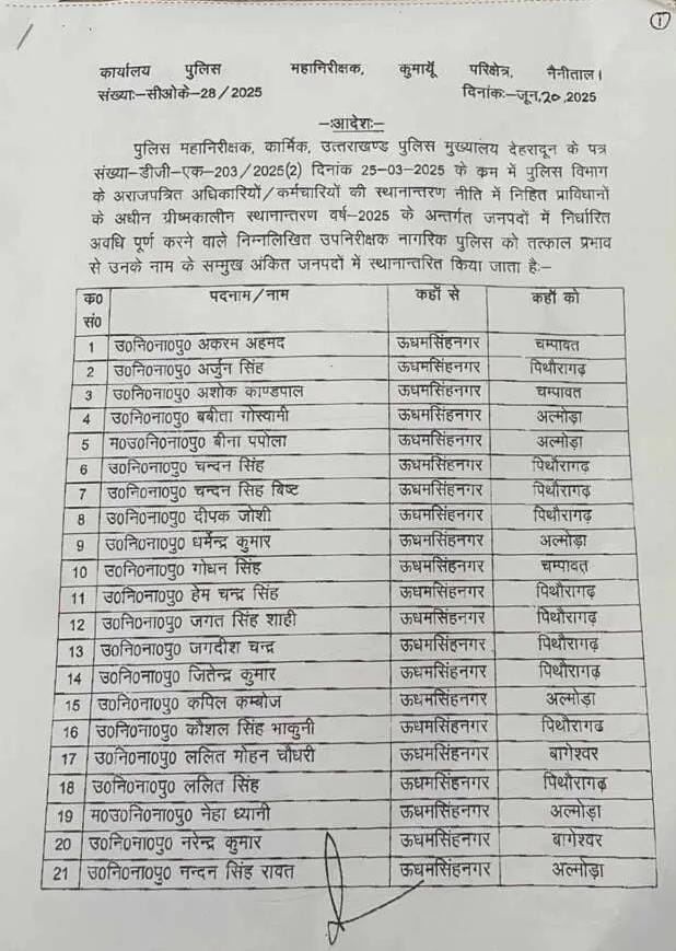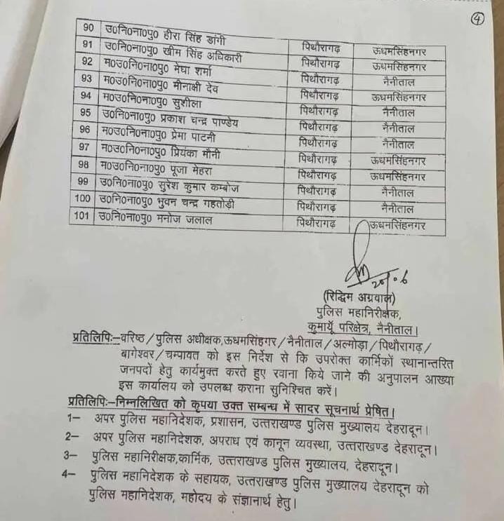 आईजी कुमाऊं रिद्धिम अग्रवाल ने 101 उप निरीक्षकों के ट्रांसफर आर्डर जारी किए हैं। कुमाऊं मंडल के 101 दरोगा मैदानी क्षेत्र में और मैदानी क्षेत्र के दरोगाओं को पहाड़ भेजा गया है।