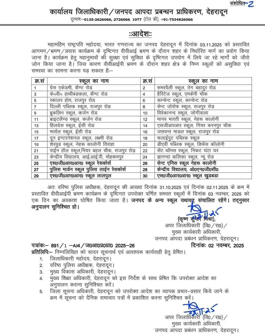 उत्तराखंड की सिल्वर जुबली समारोह में प्रतिभाग करने पहुंची राष्ट्रपति के प्रस्तावित आगमन और वीवीआईपी मूवमेंट को ध्यान में रखते हुए दून जिला प्रशासन ने बड़ा निर्णय लिया है। सुरक्षा और यातायात व्यवस्था को सुचारू रखने के उद्देश्य से देहरादून के उन 20 स्कूलों को 3 नवम्बर 2025 (सोमवार) को एक दिन के लिए बंद रखने के आदेश जारी किए गए हैं जो कि वीवीआईपी मूवमेंट के रास्ते में आ रहे है।