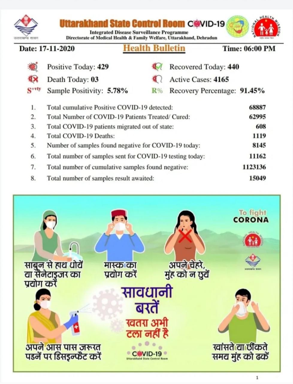 अगर जिलावार बात की जाए तो अल्मोड़ा में 22,बागेश्वर में 14, चमोली में 17, चंपावत में 8, देहरादून में 142, हरिद्वार में 18, नैनीताल में 52, पौड़ी में 30, पिथौरागढ़ 35, रुद्रप्रयाग 36, टिहरी में 12, उधमसिंहनगर में 19, उत्तरकाशी में 31 सैंपल पॉजिटिव मिले हैं।
