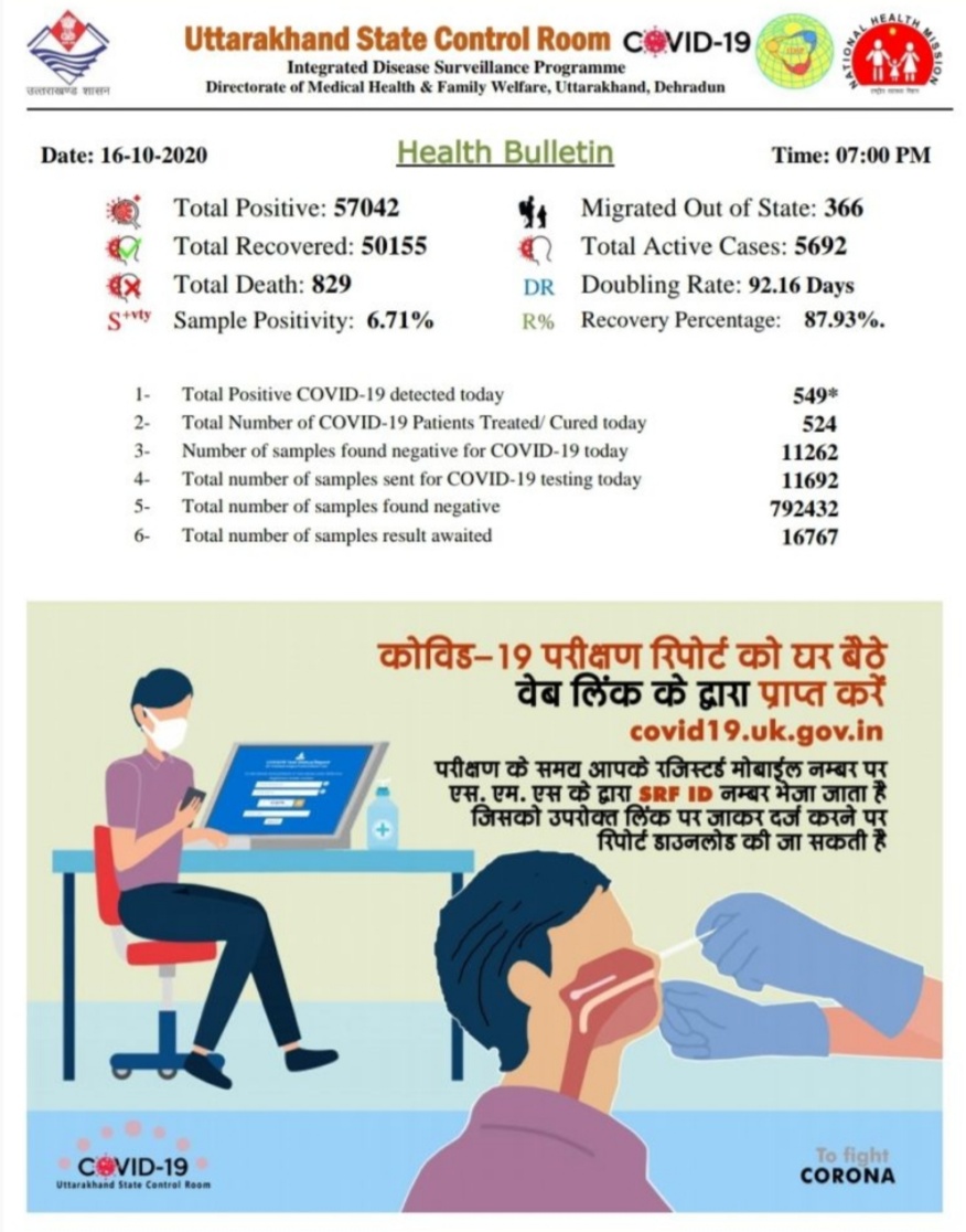 उत्तराखंड मे कोरोना संक्रमितों का आंकड़ा 57042 पहुंचा। राज्य में अभी तक 50155 कोरोना पॉजिटिव मरीज ठीक हो चुके हैं । सूबे में फिलहाल कोरोना संक्रमितों के 5692 एक्टिव केस है। राज्य में अभी तक 829 कोरोना पॉजिटिव मरीजो की मृत्यु हो चुकी है । अभी तक 792432 सैम्पल की रिपोर्ट निगेटिव आ चुकी है। 16767 मरीजों की सैम्पल रिपोर्ट पेंडिंग है। जबकि आज 11262 सैम्पल की रिपोर्ट निगेटिव आई है।शुक्रवार टेस्टिंग के लिए लैब में भेजे गए सैम्पल 11692,रिकवरी रेट 87-93,डबलिंग रेट 92.16 है।