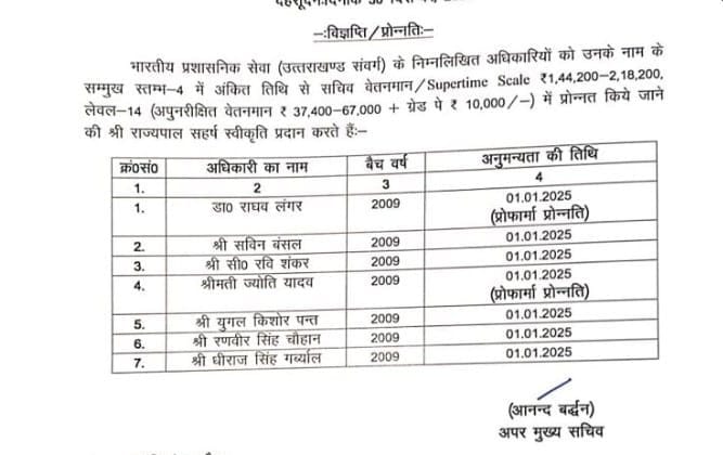 उत्तराखंड के राज्यपाल गुरमीत सिंह के आदेश पर भारतीय प्रशासनिक सेवा (उत्तराखंड संवर्ग) के कुल 7 अधिकारियों को सचिव वेतनमान/सुपरटाइम स्केल ₹1,44,200-2,18,200, लेवल-14 (अपुनरीक्षित वेतनमान ₹37,400-67,000 + ग्रेड पे ₹10,000/-) में प्रोन्नत करने की स्वीकृति प्रदान की गई है।