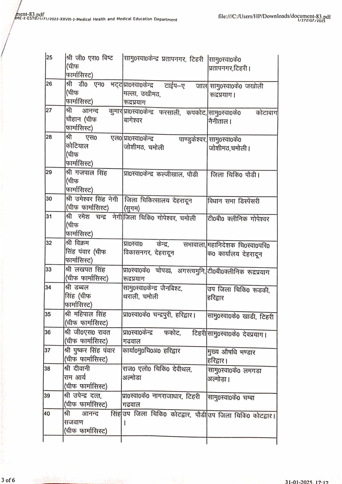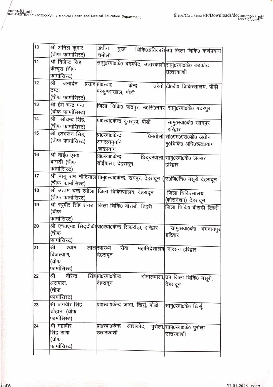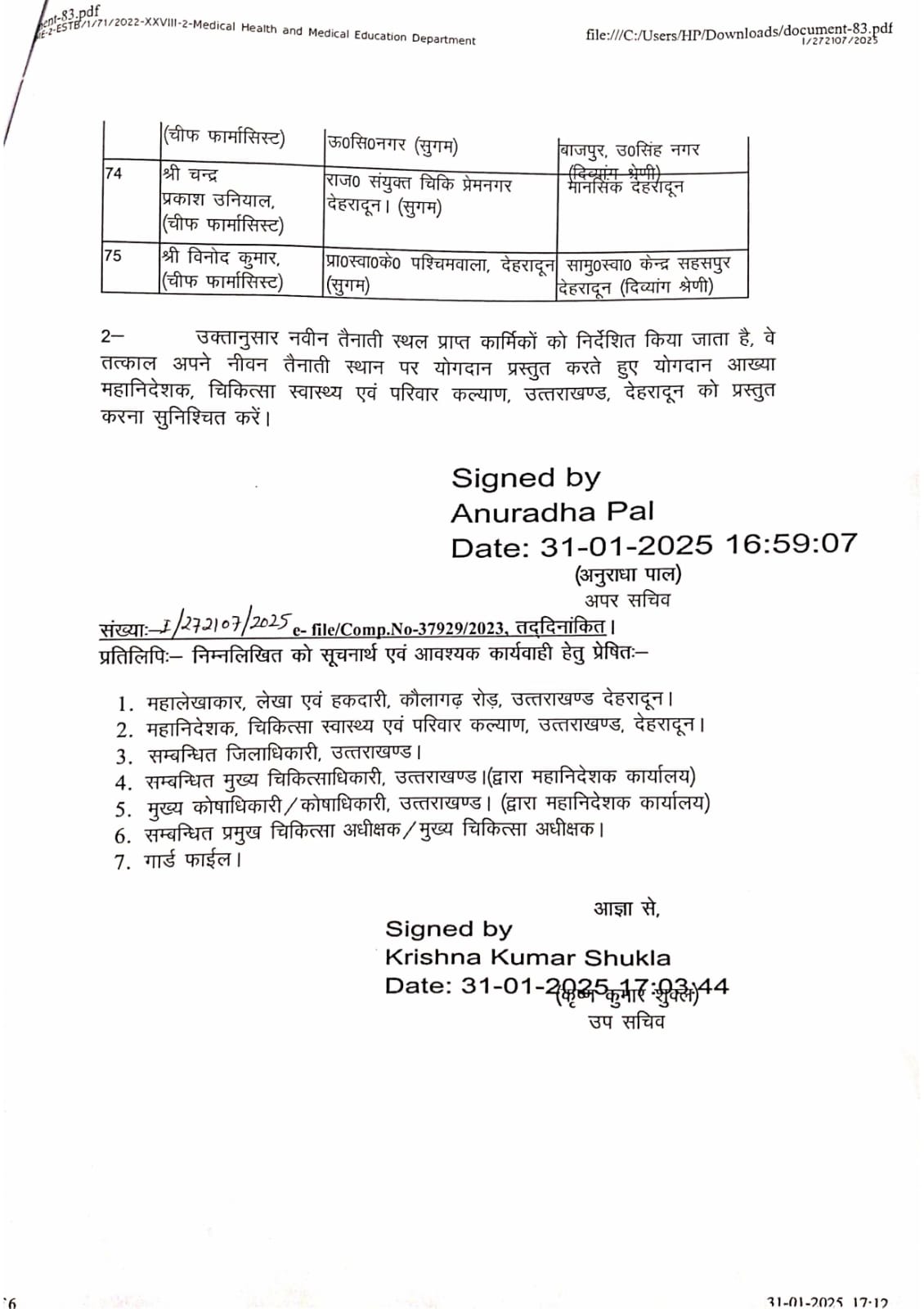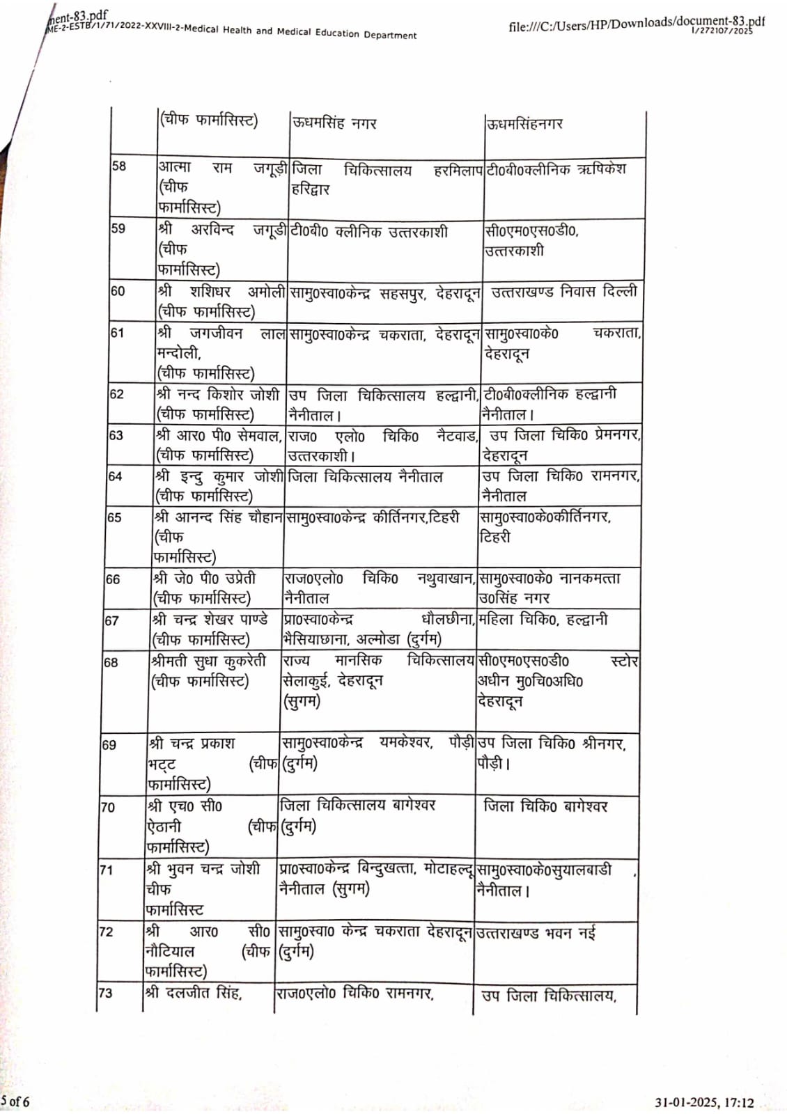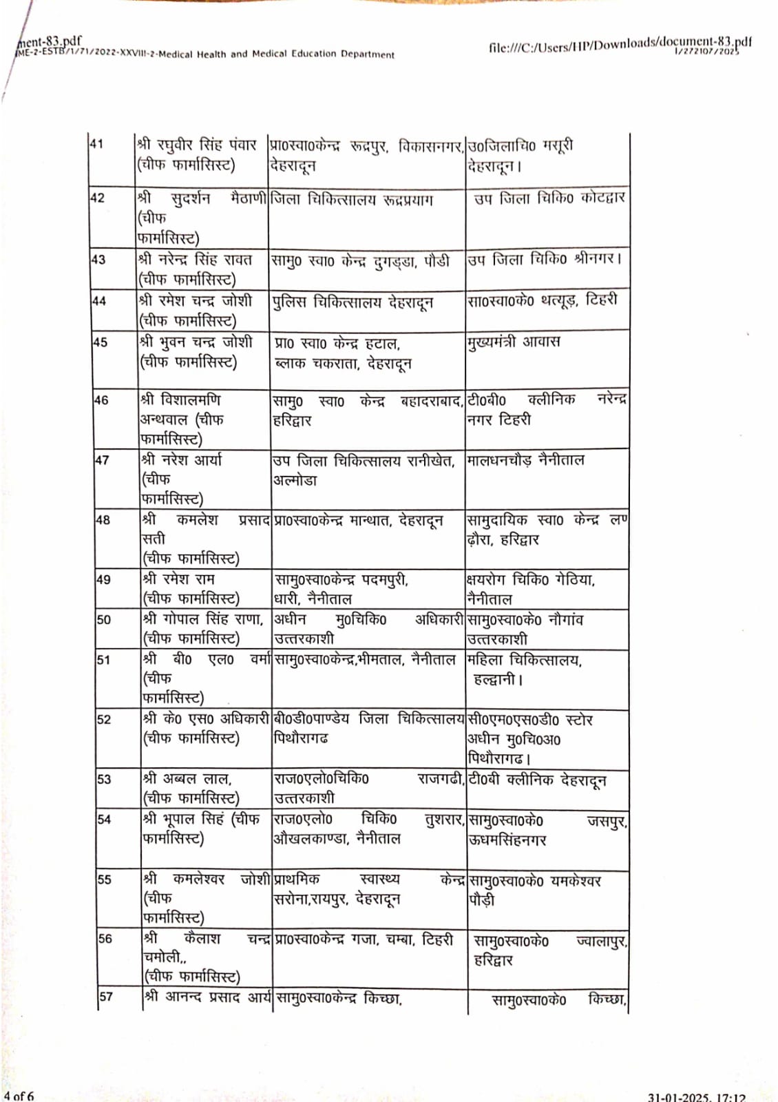 उत्तराखंड स्वास्थ्य विभाग में 75 चीफ फार्मासिस्टों का प्रदेश के विभिन्न स्वास्थ्य केन्द्रों व जिला अस्पतालों में तबादला किया गया है।