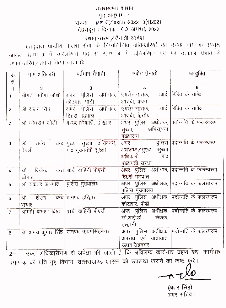 जबकि शेखर चंद्र सुयाल की अप्पर पुलिस अधीक्षक कोटद्वार पौड़ी में तैनाती ,कमला बिष्ट की अप्पर पुलिस अधीक्षक सी आई डी सेक्टर हल्द्वानी में तैनाती,