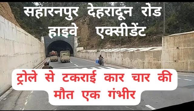 रविवार तड़के लगभग 3 बजे एक कार जिसमें हरियाणा के पांच लोग सवार थे,सहारनपुर से देहरादून की तरफ आते हुए ट्रोले को क्रॉस करने के चक्कर में उसके पीछे से टकरा गए। टक्कर इतनी भयानक थी कि चार लोगों की मौके पर ही मौत हो गई एक युवक हस्पताल में जिंदगी और मौत की जन जी लड़ रहा है।