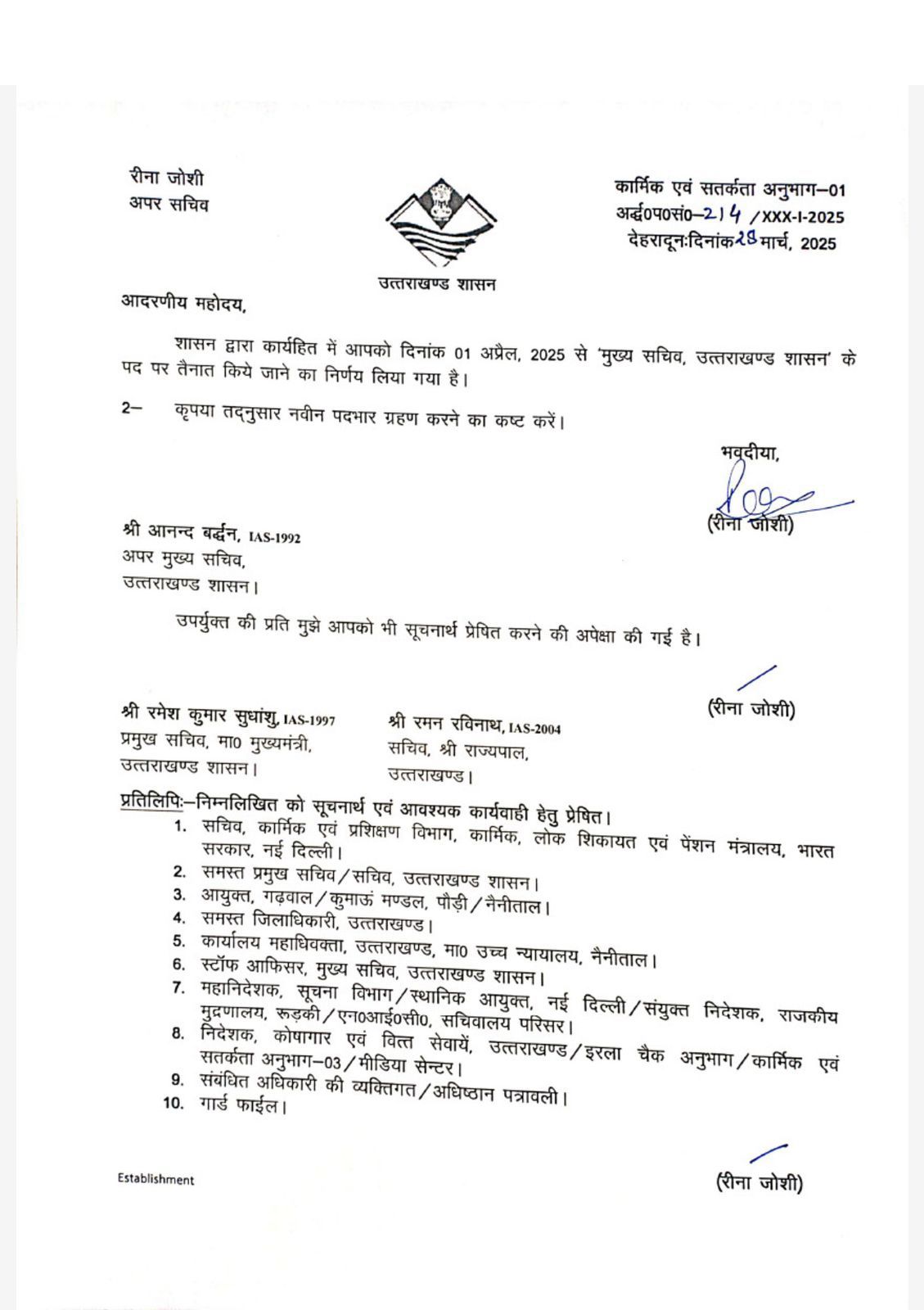उत्तराखंड के वरिष्ठ आईएएस अधिकारी आनंद वर्धन को प्रदेश का नया मुख्य सचिव नियुक्त कर दिया गया है। राज्य सरकार ने इस संबंध में आदेश जारी कर दिया है।