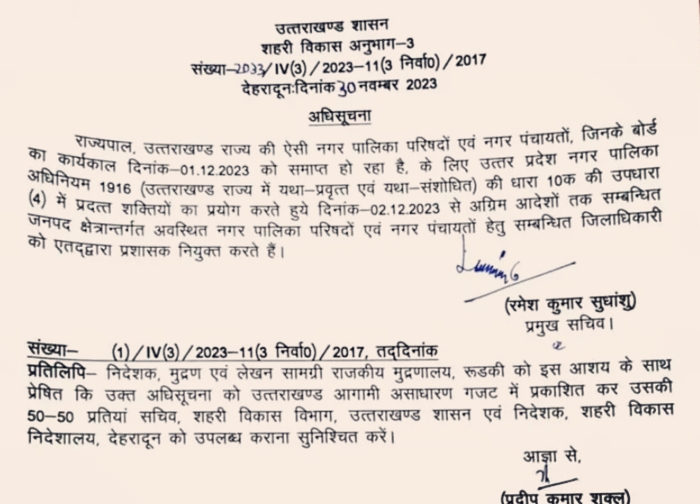 प्रमुख सचिव शहरी विकास रमेश कुमार सुधांशु की ओर से जारी आदेश के अनुसार जिन नगर निगमों, नगर पालिका परिषदों व नगर पंचायतों का कार्यकाल एक दिसंबर को खत्म हो रहा है, उनमें दो दिसंबर से अग्रिम आदेशों तक जिलाधिकारी प्रशासक होंगे।
