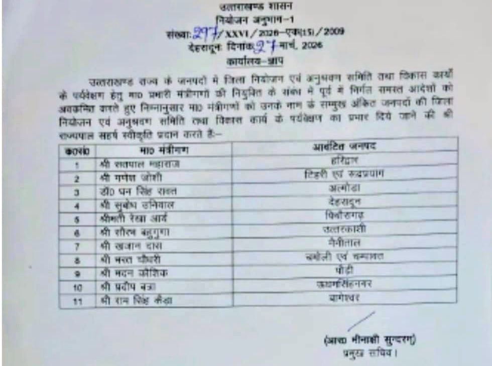 प्रमुख सचिव नियोजन आर मीनाक्षी सुंदरम की ओर से जारी आदेश के मुताबिक, कैबिनेट मंत्री सतपाल महाराज को हरिद्वार, गणेश जोशी को टिहरी व रुद्रप्रयाग, डॉ. धन सिंह रावत को अल्मोड़ा, सुबोध उनियाल को देहरादून, रेखा आर्य को पिथौरागढ़, सौरभ बहुगुणा को उत्तरकाशी, खजान दास को नैनीताल, भरत चौधरी को चमोली व चंपावत, मदन कौशिक को पौड़ी,प्रदीप बत्रा को ऊधमसिंह नगर और राम सिंह कैड़ा को बागेश्वर का प्रभारी मंत्री बनाया गया है।