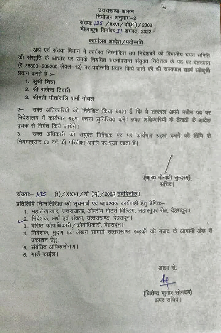 जारी की गई विज्ञप्ति के अनुसार उत्तराखंड शासन द्वारा अर्थ एवं संख्या विभाग में कार्यरत उपनिदेशको गीतांजलि शर्मा गोयल, चित्रा, राजेंद्र तिवारी को विभागीय चयन समिति की संस्तुति के आधार पर संयुक्त निदेशक के पद पर ( वेतनमान ( ₹ 78800 – 209200 लेबल-12 ) पदोन्नति प्रदान कर तत्काल नवीन पद पर तैनाती के सचिव नियोजन आर मीनाक्षी सुंदरम द्वारा आदेश जारी किये गये ।