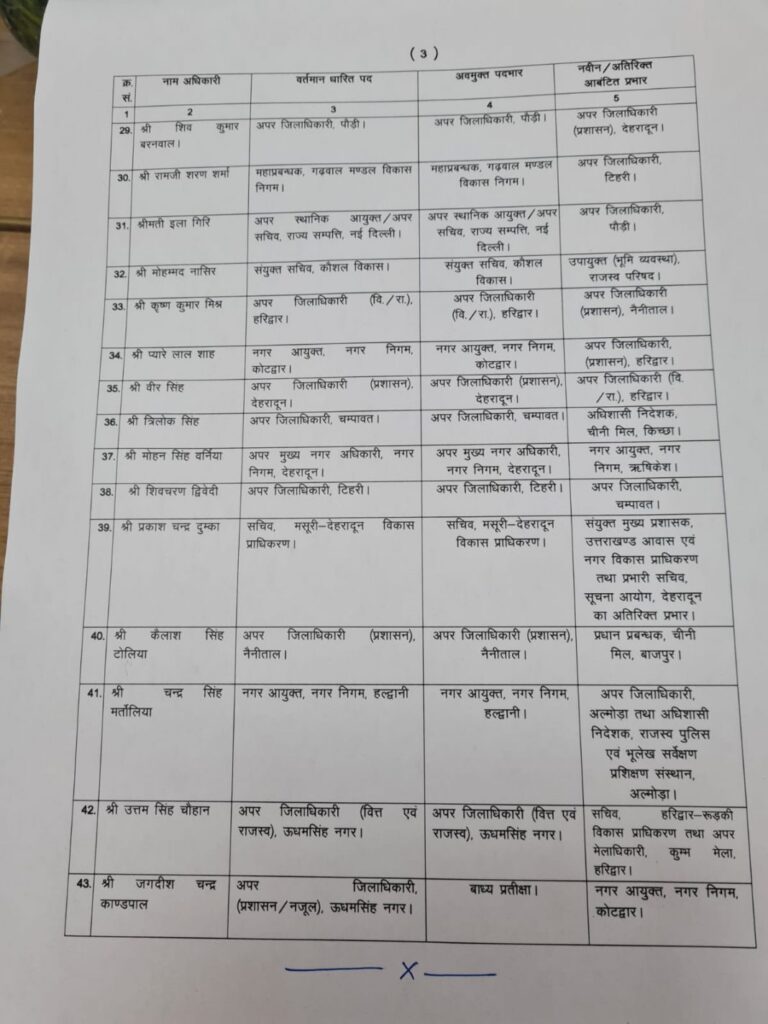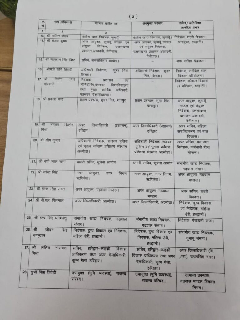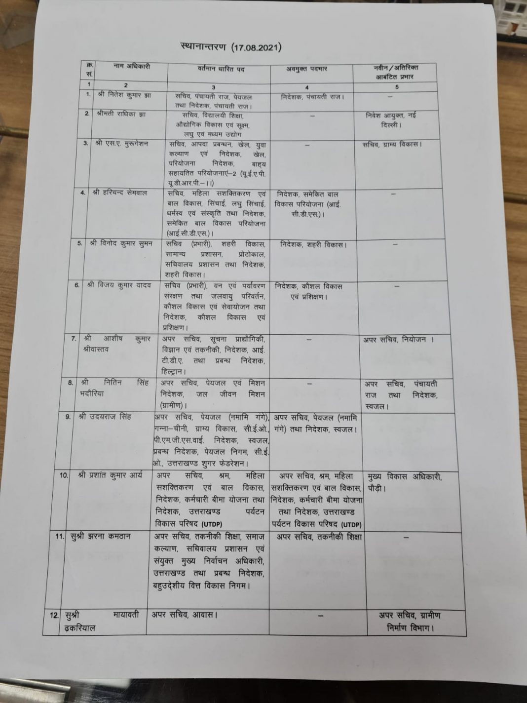 धामी सरकार ने मंगलवार की रात फिर से शासन में तैनात अधिकारियों के बम्पर ट्रांसफर की लिस्ट जारी कर दी गयी है।