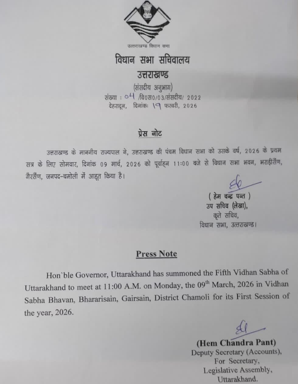 उत्तराखंड प्रदेश कांग्रेस कमेटी के अध्यक्ष गणेश गोदियाल ने आगामी विधानसभा सत्र को लेकर चिंता व्यक्त की है। 9 मार्च (सोमवार) को राज्यपाल का अभिभाषण प्रस्तावित है। परंपरागत रूप से सोमवार का दिन मुख्यमंत्री के प्रश्नकाल के लिए निर्धारित माना जाता रहा है, किंतु यह अत्यंत खेदजनक है कि मुख्यमंत्री धामी ने अपने लगभग पाँच वर्षों के कार्यकाल में एक भी सोमवार के प्रश्नकाल का प्रत्यक्ष रूप से सामना नहीं किया है।