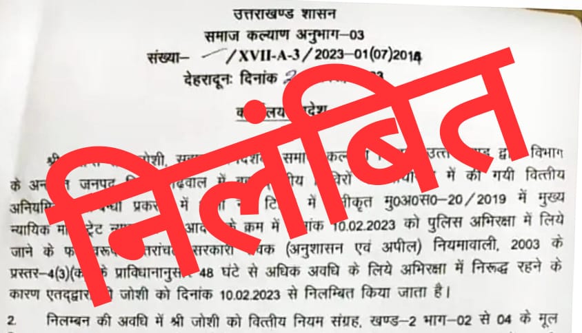 उत्तराखंड शासन द्वारा समाज कल्याण विभाग में सहायक निदेशक के पद पर तैनात कांति राम जोशी को निलंबित कर दिया गया है।