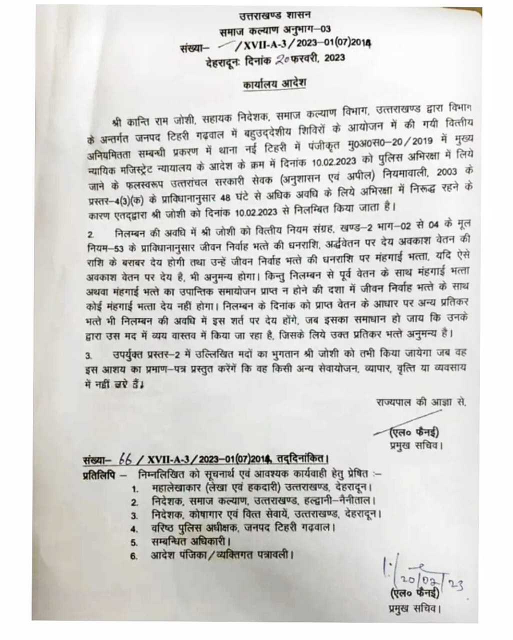 प्रमुख सचिव एल फैनई द्वारा जारी आदेश में कहा गया है कि, टिहरी गढ़वाल में बहुउद्देश्यीय शिविरों के आयोजन में की गई वित्तीय अनियमितताओं के संबंधित प्रकरण में थाना नई टिहरी में पंजीकृत मुकदमा और न्यायालय के आदेश के क्रम में पुलिस अभिरक्षा में लिए जाने के फलस्वरूप उत्तरांचल सरकारी सेवक अनुशासन एवं अपील नियमावली 2003 के अनुसार 48 घंटे की अवधि तक के लिए अभिरक्षा में निरूद्ध रहने के कारण कांति राम जोशी को दिनांक 10 फरवरी 2023 से निलंबित किया जाता है।