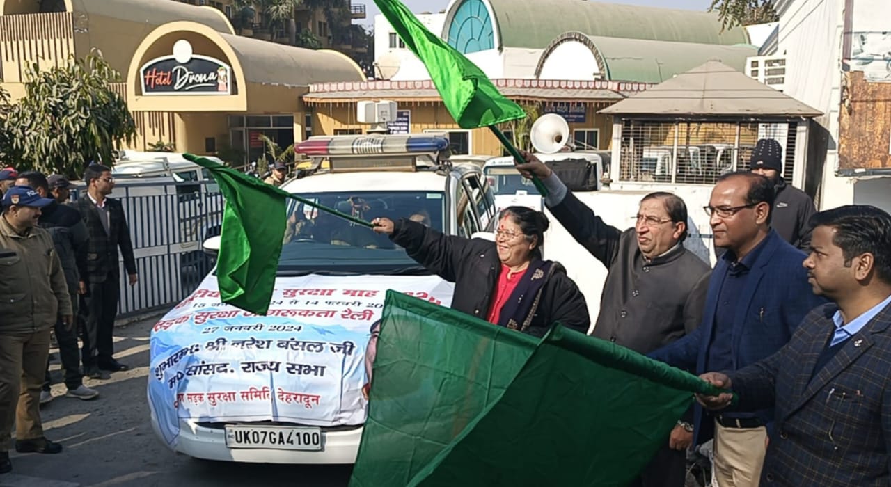 राष्ट्रीय सड़क सुरक्षा माह में सड़क सुरक्षा जागरूकता कार्यक्रम की श्रृंखलाओं में शनिवार को आयोजित सड़क सुरक्षा रैली राज्यसभा सांसद नरेश बंसल द्वारा होटल द्रोण से हरी झण्डी दिखाकर रवाना किया। जागरूकता रैली होटल द्रोण से संभागीय परिवहन विभाग के कार्यालय राजपुर रोड पर समाप्त हो गई। उन्होंने कहा कि सड़क सुरक्षा हेतु जागरूकता की आवश्यकता है, प्रत्येक वर्ष लाखों लोग रैस ड्राईव के कारण दुर्घटना का शिकार होते हैं, लोगों का जीवन बचाने के लिए जागरूकता की आवश्यकता है इसलिए इस रैली का फ्लैग ऑफ किया गया हैै। कहा कि सरकार का यही प्रयास है कि दुर्घटनाओं में 50 प्रतिशत् से अधिक की कमी लाई जाए इसके लिए सड़कों का निर्माण एवं सुरक्षात्मक उपाय अपनाये जा रहे है। आम आदमी को जागरूक होने की आवश्यकता है।