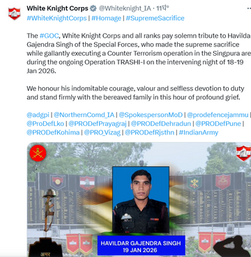 कोर ने बताया कि हवलदार गजेंद्र सिंह ने 18-19 जनवरी की रात को सिंगपोरा इलाके में चल रहे आतंकवाद विरोधी अभियान के दौरान बहादुरी से कार्रवाई करते हुए सर्वोच्च बलिदान दिया। पोस्ट में उनके साहस, वीरता और कर्तव्यनिष्ठा को नमन करते हुए शोकाकुल परिवार के साथ खड़े रहने की बात कही गई।