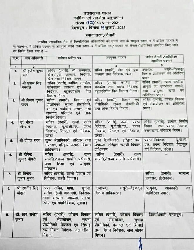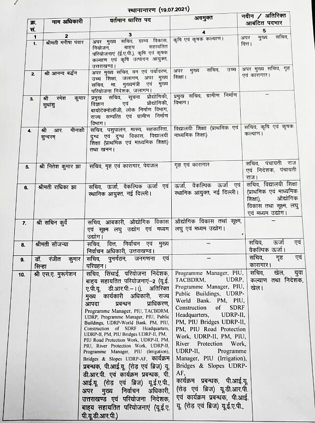नवनियुक्त सीएम पुष्कर सिंह धामी सरकार ने सोमवार की रात आखिर आईएएस ट्रान्सफर लिस्ट उनकी नई जिम्मेदारी के साथ जारी कर ही दी।