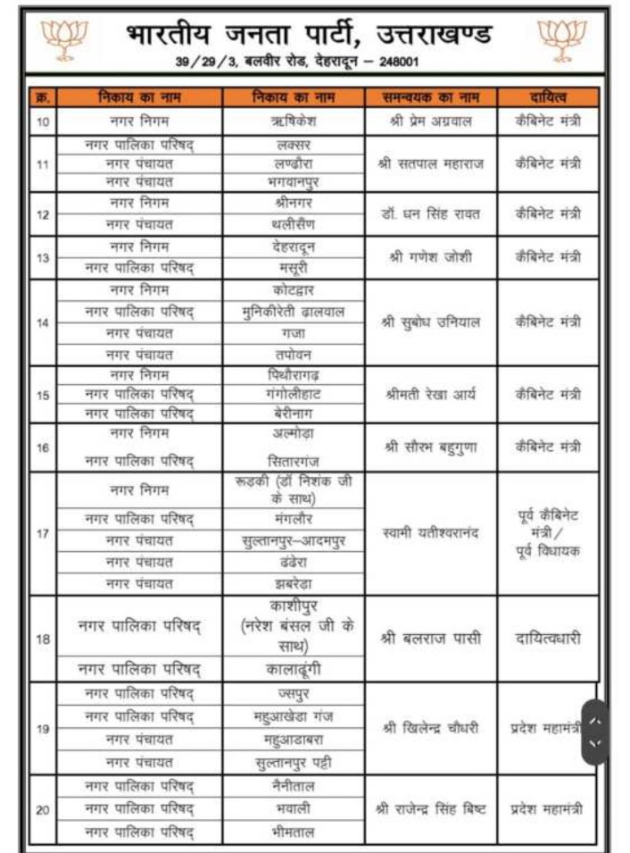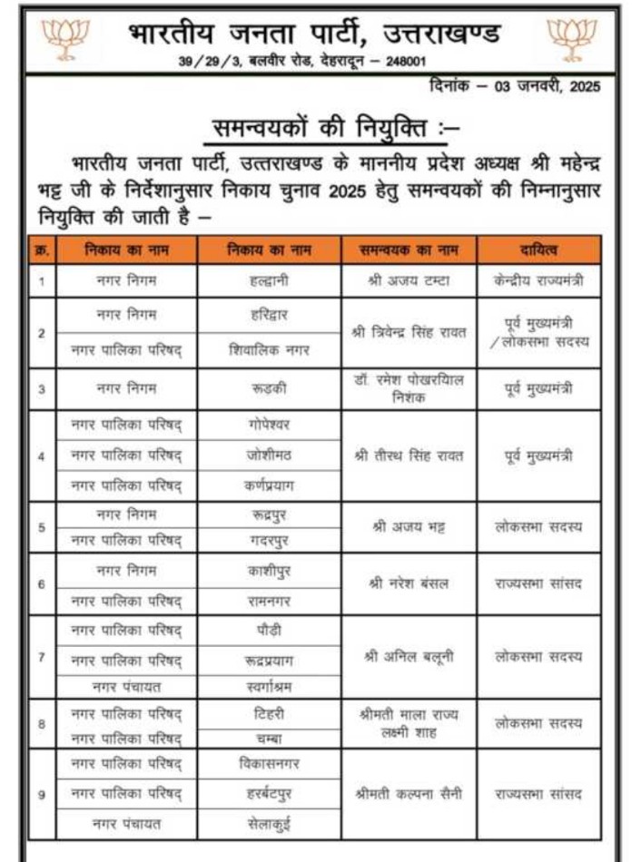 भाजपा ने प्रदेश मे सभी नगर निगम, नगर पालिका तथा नगर पंचायतों मे चुनाव संचालन के लिए समन्वयक नियुक्त किये है।