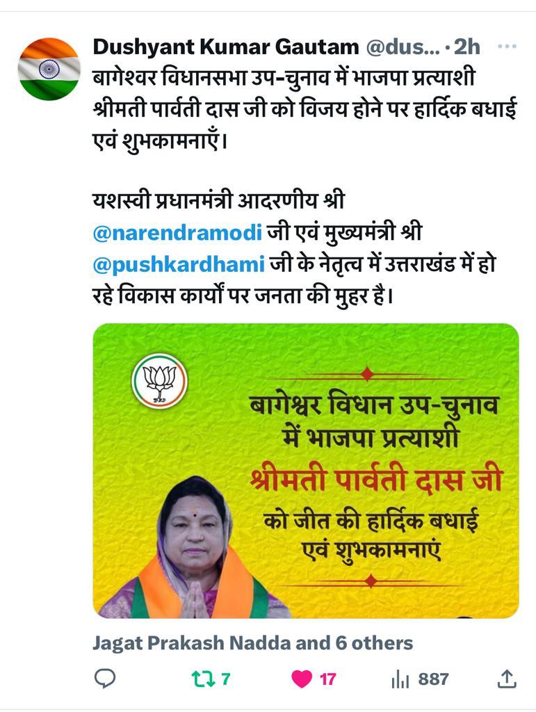 भाजपा ने बागेश्वर उपचुनाव की जीत को स्वर्गीय रामदास के कामों और धामी सरकार की विकास नीति व डबल इंजन की सरकार के कार्यों पर जनता की मुहर बताया है।