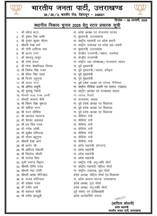 वहीं प्रदेश अध्यक्ष महेंद्र भट्ट पूर्व सीएम, सांसद, मंत्रीगण समेत पार्टी की तरफ से घोषित होने वाले स्टार प्रचारकों के साथ पार्टी के पक्ष में माहौल तैयार करेंगे।