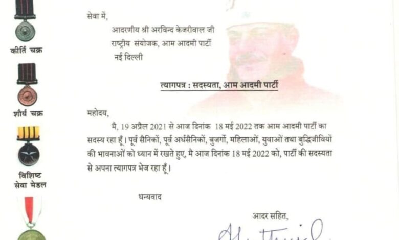 मै, 19 अप्रैल 2021 से आज दिनांक 18 मई 2022 तक आम आदमी पार्टी का सदस्य रहा हूँ। पूर्व सैनिकों, पूर्व अर्धसैनिकों, बुजर्गों, महिलाओं, युवाओं तथा बुद्धिजीवियों की भावनाओं को ध्यान में रखते हुए, मै आज दिनांक 18 मई 2022 को, पार्टी की सदस्यता से अपना त्यागपत्र भेज रहा हूँ।