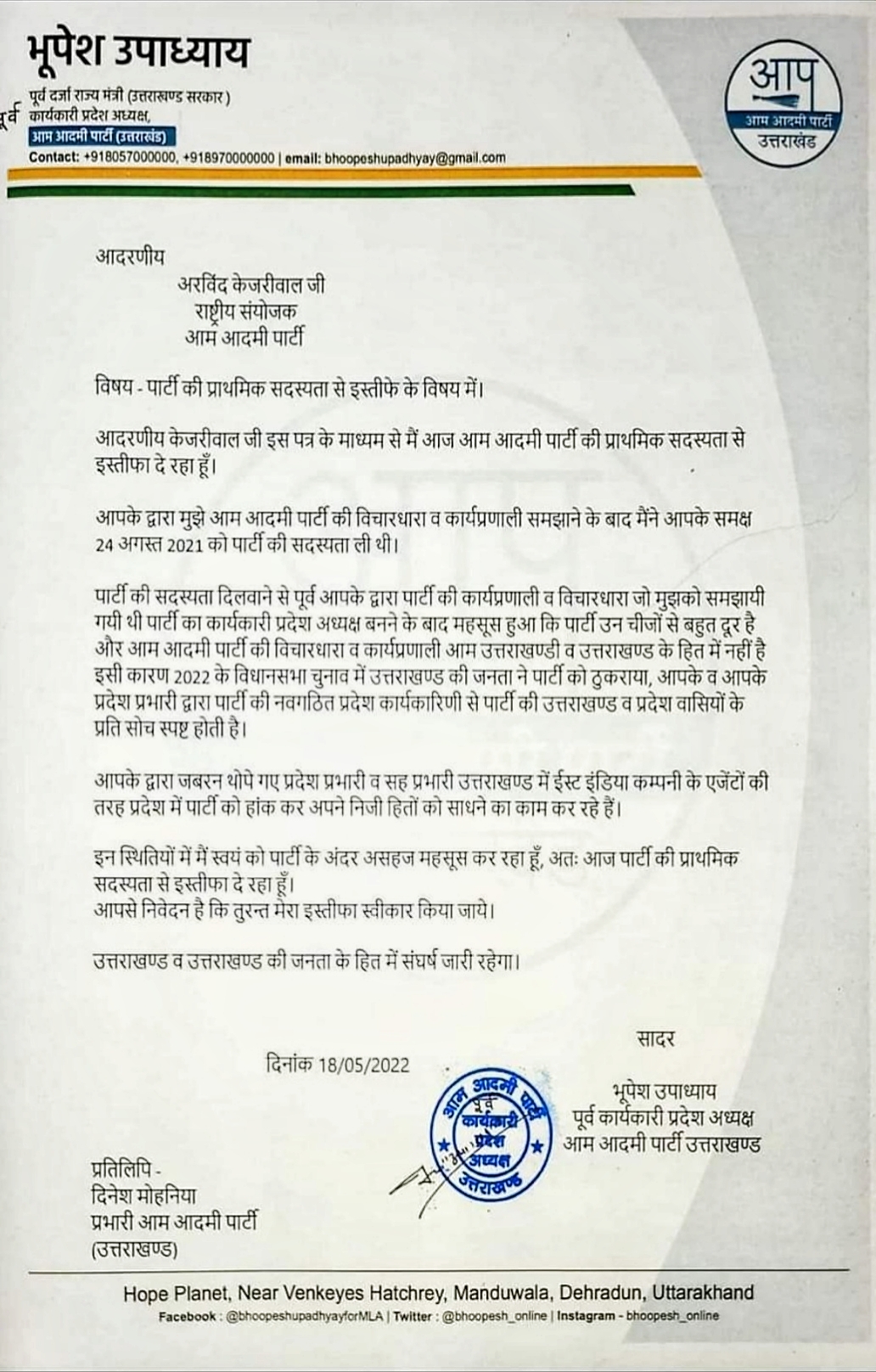 पार्टी की सदस्यता दिलवाने से पूर्व आपके द्वारा पार्टी की कार्यप्रणाली व विचारधारा जो मुझको समझायी गयी थी पार्टी का कार्यकारी प्रदेश अध्यक्ष बनने के बाद महसूस हुआ कि पार्टी उन चीजों से बहुत दूर है और आम आदमी पार्टी की विचारधारा व कार्यप्रणाली आम उत्तराखण्डी व उत्तराखण्ड के हित में नहीं है। इसी कारण 2022 के विधानसभा चुनाव में उत्तराखण्ड की जनता ने पार्टी को ठुकराया, आपके व आपके प्रदेश प्रभारी द्वारा पार्टी की नवगठित प्रदेश कार्यकारिणी से पार्टी की उत्तराखण्ड व प्रदेश वासियों के प्रति सोच स्पष्ट होती है।
