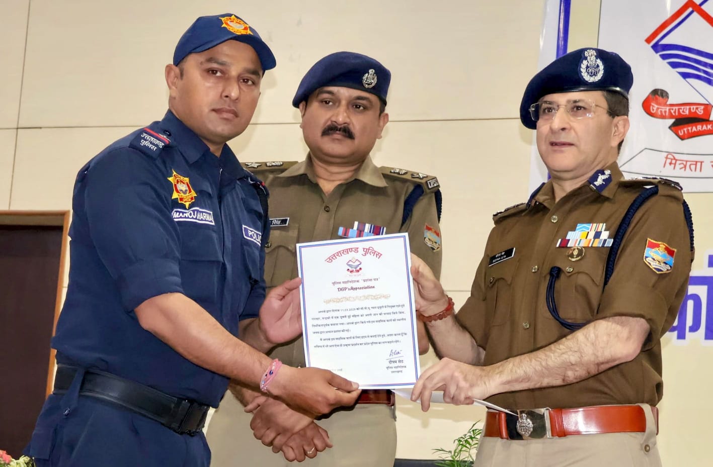 कार्यक्रम के अंत मे पुलिस महानिदेशक महोदय द्वारा पदोन्नति प्रशिक्षण में अन्त: तथा बाहय विषयों में प्रथम स्थान तथा सर्वांग सर्वोत्तम स्थान प्राप्त करने वाले पुलिस कर्मियों को पुरूस्कृत करते हुए उनका उत्साहवर्धन किया गया। इसके अतिरिक्त जनपद हरिद्वार के रूडकी क्षेत्रान्तर्गत सोनाली पार्क के पास एक महिला द्वारा गंगनहर में छलांग लगाकर आत्महत्या का प्रयास करने की घटना में गस्त डयूटी में नियुक्त सीपीयू कर्मियों द्वारा त्वरित कार्यवाही कर उक्त महिला को सुरक्षित रूप से बाहर निकालने की घटना में शामिल अ0उ0नि0 मनोज शर्मा व हे0कां0 कृपा राम चौहान को प्रशस्ति पत्र व 10000 हज़ार रुपये के नगद पुरुस्कार से सम्मानित किया गया।