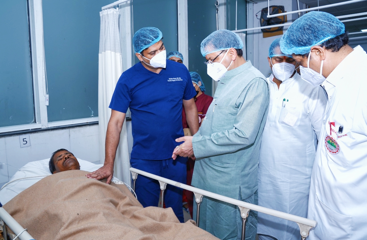 एम्स में भर्ती नमामि गंगे प्रोजेक्ट चमोली में करेंट से हुए घायलो से मिलने पहुंचे सीएम धामी व अन्य