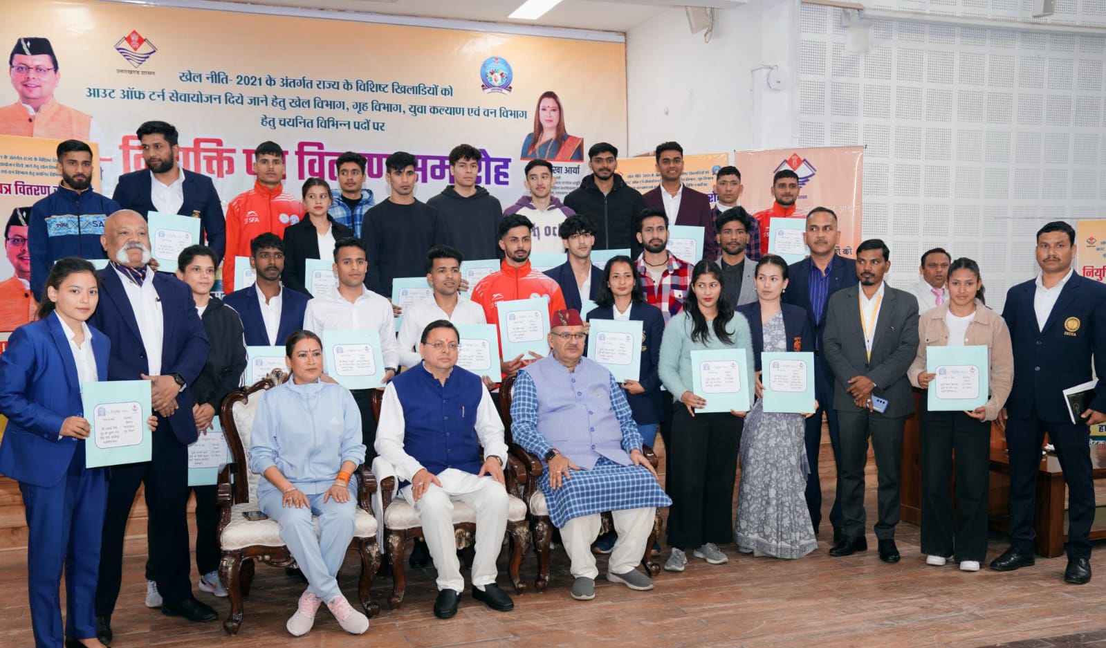 मुख्यमंत्री पुष्कर सिंह धामी ने सोमवार को मुख्य सेवक सदन में खेल नीति-2021 के अंतर्गत विभिन्न पदों पर चयनित राज्य के 31 विशिष्ट खिलाड़ियों को खेल विभाग, गृह विभाग, युवा कल्याण एवं वन विभाग में आउट ऑफ टर्न सेवायोजन, परिवहन विभाग में 25 कनिष्ठ सहायकों तथा उद्यान विभाग में 28 सहायक लेखाकारों को नियुक्ति पत्र प्रदान किये। इस प्रकार कुल 84 अभ्यर्थियों को मुख्यमंत्री ने नियक्ति पत्र वितरित किये।