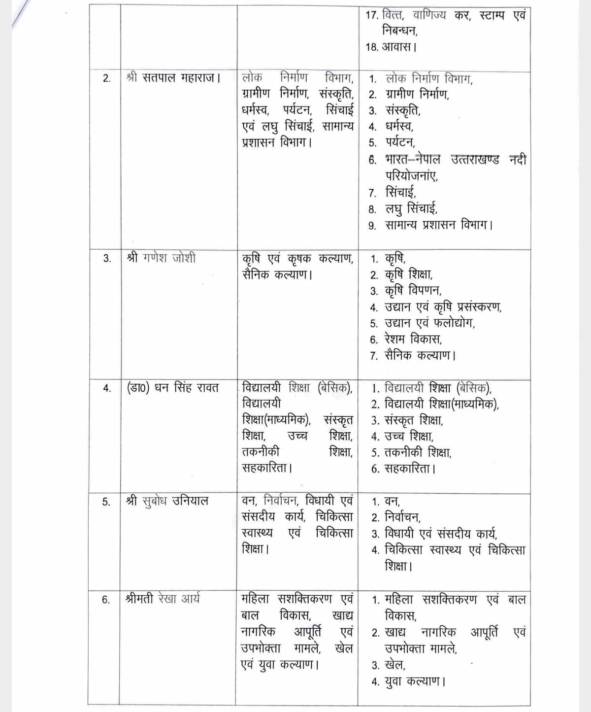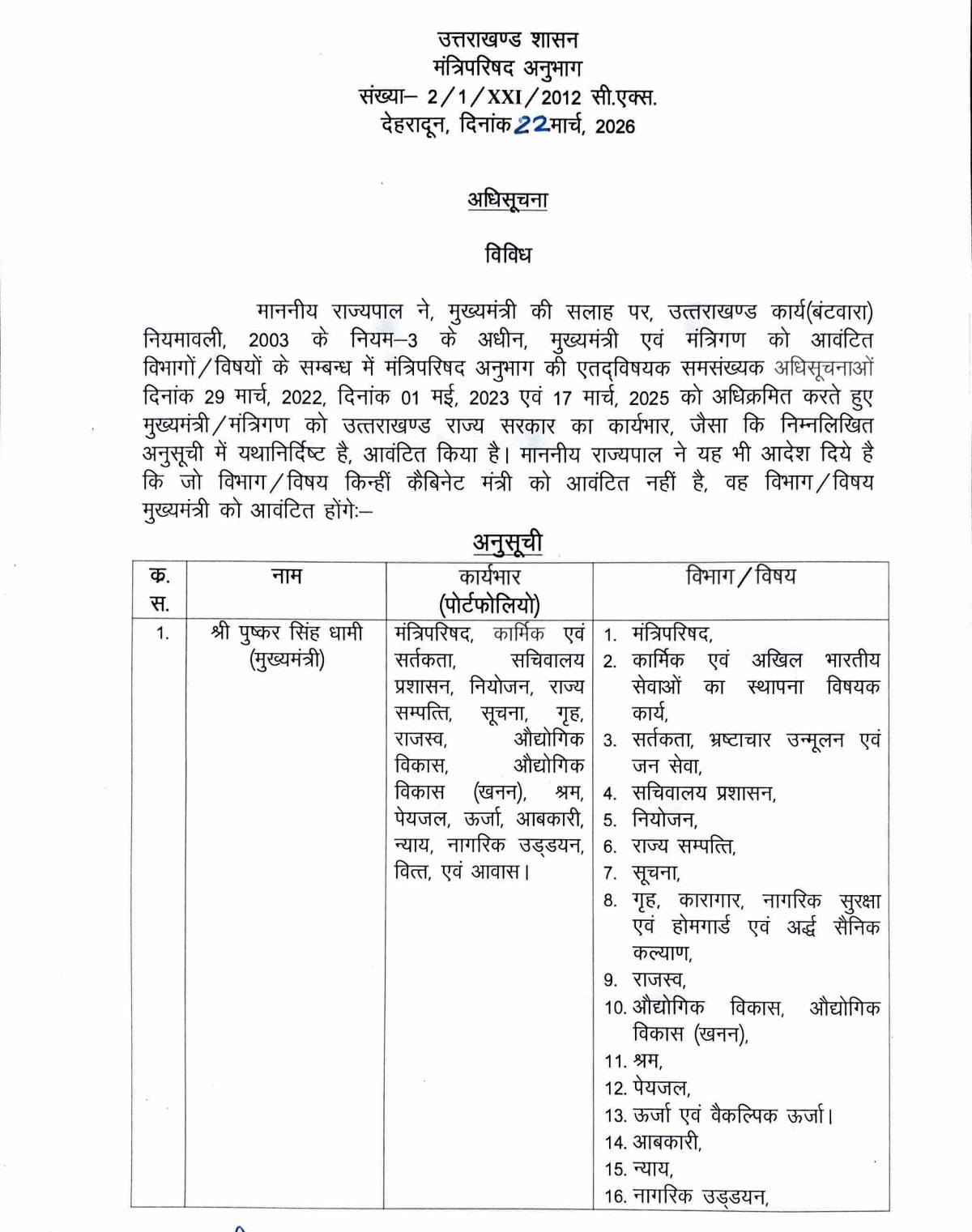 सीएम धामी ने बहुप्रतीक्षित मंत्रिमंडल विस्तार के बाद बनाए हुए नये मंत्रियों के बीच विभागों का रविवार को बंटवारा कर दिया है। पाँच नए मंत्रियों के शपथ ग्रहण के पश्चात किए गए इस आवंटन में मुख्यमंत्री ने कई महत्वपूर्ण और संवेदनशील प्रशासनिक विभाग अपने पास ही रखे हैं। अब तक मुख्यमंत्री के पास 35 से अधिक विभागों का दायित्व था।