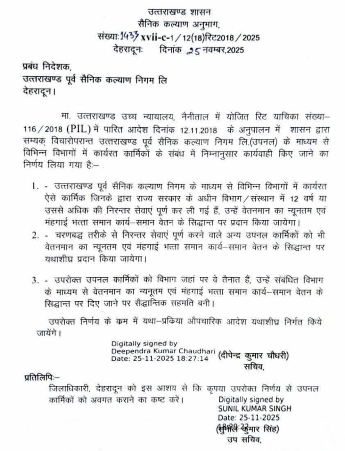 राज्य सरकार के अधीन विभागों/संस्थानों में UPNL के माध्यम से तैनात ऐसे कार्मिक, जिन्होंने 12 वर्ष या उससे अधिक की निरंतर सेवा पूर्ण कर ली है, उन्हें समान कार्य-समान वेतन के सिद्धांत पर वेतनमान का न्यूनतम वेतन एवं महंगाई भत्ता प्रदान किया जाएगा।