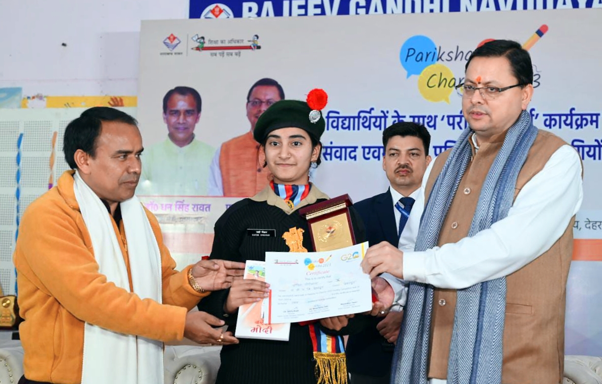 संवाद के दौरान छात्रा कु. शैलजा कुकरेती, छात्रा खुशी, पूजा, निशा गुप्ता रानी, छात्र रामकरण, युवराज आदि द्वारा परीक्षा की तैयारियों एवं मुख्यमंत्री से बचपन में परीक्षाओं की तैयारी से संबंधित प्रश्नों के उत्तर में मुख्यमंत्री ने कहा कि परीक्षा के समय कुछ तनाव सभी को रहता है किंतु पहले के और अबके समय में बड़ा अंतर है। आज पूरी दुनिया आपके मोबाइल में सिमटी है। पहले संसाधनों का अभाव था, उनकी प्राइमरी शिक्षा स्लेट, दफ्ती, दवात और टाट पट्टी में बैठकर हुई। 3-4 कि.मी. पैदल चलकर स्कूल जाना पड़ता था। उन्होंने छात्रों से कहा कि वे अपनी सोच सकारात्मक रखें, आप जैसा बनना चाहेंगे वही बनेंगे। आज हमारे साथ हमारे अभिभावक के रूप में प्रधानमंत्री मोदी जैसा व्यक्तित्व है जो परीक्षा के समय छात्रों से चर्चा कर उनका मार्ग दर्शन कर रहे हैं।