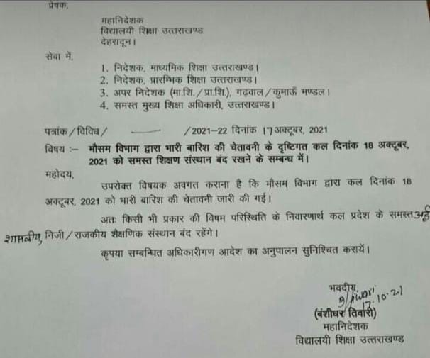प्रदेश में भारी बारिश के अलर्ट को देखते हुए मुख्यमंत्री पुष्कर सिंह धामी ने सचिवालय में सभी जिलाधिकारियों और आपदा प्रबंधन से जुङे विभागों और एजेंसियों के वरिष्ठ अधिकारियों के साथ प्रदेश की स्थिति की जानकारी ली। मुख्यमंत्री ने जिलाधिकारियों से उनकी तैयारियों, बारिश की स्थिति आदि के बारे में विस्तार से जानकारी ली। मुख्यमंत्री ने प्रदेश के सभी स्कूलों में 18 अक्टूबर को अवकाश रखने के निर्देश दिये। बहुत से जिलों में अवकाश कर भी दिया गया है। जिन जिलों में नहीं किया गया है, वे भी एहतियातन सोमवार को स्कूलों में अवकाश घोषित कर दें।
