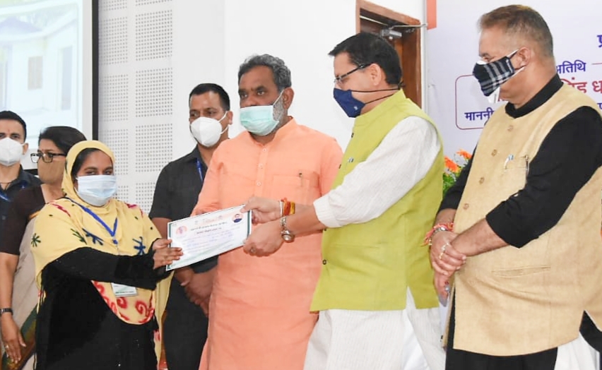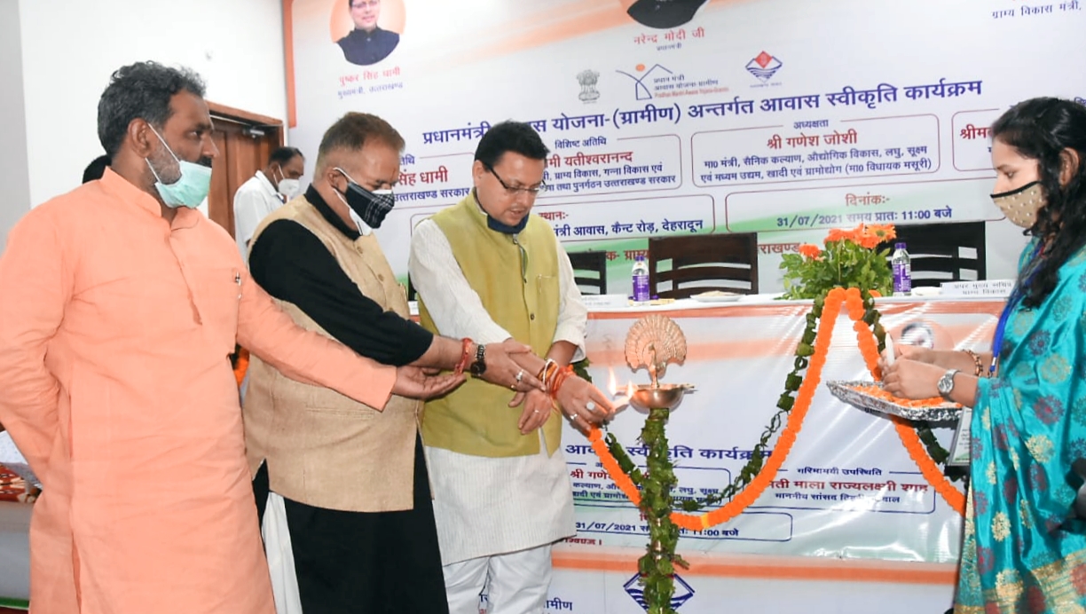 मुख्यमंत्री पुष्कर सिंह धामी ने प्रधानमंत्री आवास योजना- ग्रामीण के अंतर्गत चिन्हित लाभार्थियों को आवास स्वीकृति पत्र सौंपे। सीएम कैम्प कार्यालय परिसर स्थित जनता दर्शन हॉल में आयोजित कार्यक्रम में मुख्यमंत्री ने प्रदेश के लाभार्थियों को प्रथम किश्त की राशि डीबीटी द्वारा ऑनलाईन जारी की। उन्होंने कार्यक्रम में सौ से अधिक लोगों को आवास स्वीकृति पत्र वितरित किए।