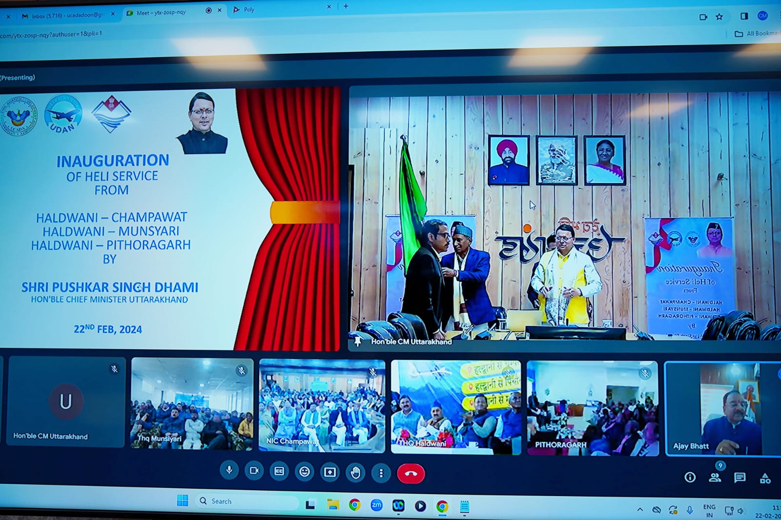 मुख्यमंत्री पुष्कर सिंह धामी ने गुरुवार को मुख्यमंत्री आवास, सभागार में नागरिक उडडयन विभाग द्वारा आयोजित कार्यक्रम में हल्द्वानी से मुनस्यारी, पिथौरागढ़, चम्पावत हेतु क्षेत्रीय कनेक्टिविटी स्कीम के अंतर्गत संचालित की जा रही हैली सेवा का वर्चुअल रूप से फ्लैग ऑफ कर शुभारम्भ किया।
