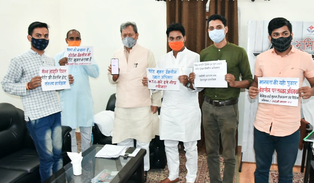 मुख्यमंत्री तीरथ सिंह रावत ने स्वदेशी जागरण मंच द्वारा कोरोना की वैक्सीन को पेटेंट मुक्त कराने के लिए चलाए जा रहे वैश्विक सर्व सुलभ टीकाकरण एवं चिकित्सा अभियान के अंतर्गत 20 जून को विश्व जागृति दिवस के दिन पेटेन्ट फ्री करने के लिए डिजिटल हस्ताक्षर कर समर्थन दिया। आज स्वदेशी जागरण मंच के प्रतिनिधि मंडल ने प्रांत के संयोजक सुरेंद्र सिंह के नेतृत्व में उत्तराखंड के मुख्यमंत्री तीरथ सिंह रावत से भेंट की तथा अभियान की जानकारी उन्हें दी जिसका समर्थन करते हुए मुख्यमंत्री तीरथ सिंह रावत ने कहा कि हमारा देश वसुदेव कुटुंबकम की बात को लेकर चलने वाला देश है, स्वदेशी जागरण मंच द्वारा चलाए जा रहे इस अभियान से कोरोना वैक्सीन पेटेंट मुक्त हो जाएगी तो वैक्सीन के उत्पादन में कोई कमी नहीं आएगी और जल्द से जल्द यह जनसामान्य तक पहुंच सकेगी। उन्होंने स्वयं इस अभियान में डिजिटल हस्ताक्षर कर अपना समर्थन दिया ।