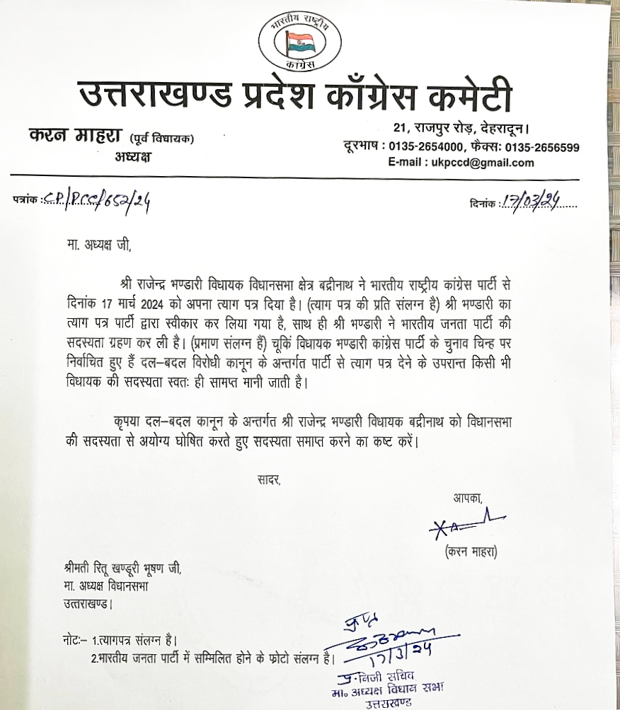 उत्तराखण्ड प्रदेष कांग्रेस कमेटी के उपाध्यक्ष संगठन/प्रशासन मथुरा दत्त जोशी ने जानकारी देते हुए बताया कि बद्रीनाथ के कांग्रेस विधायक राजेन्द्र भण्डारी द्वारा दल-बदल कर भाजपा की सदस्यता ग्रहण किये जाने का संज्ञान लेते हुए प्रदेश कांग्रेस अध्यक्ष करन माहरा ने दल-बदल कानून के अन्तर्गत विधायक राजेन्द्र भण्डारी की विधानसभा सदस्यता रद्द किये जाने हेतु विधानसभा अध्यक्ष को पत्र प्रेशित किया है। पत्र की प्रति संलग्न है।