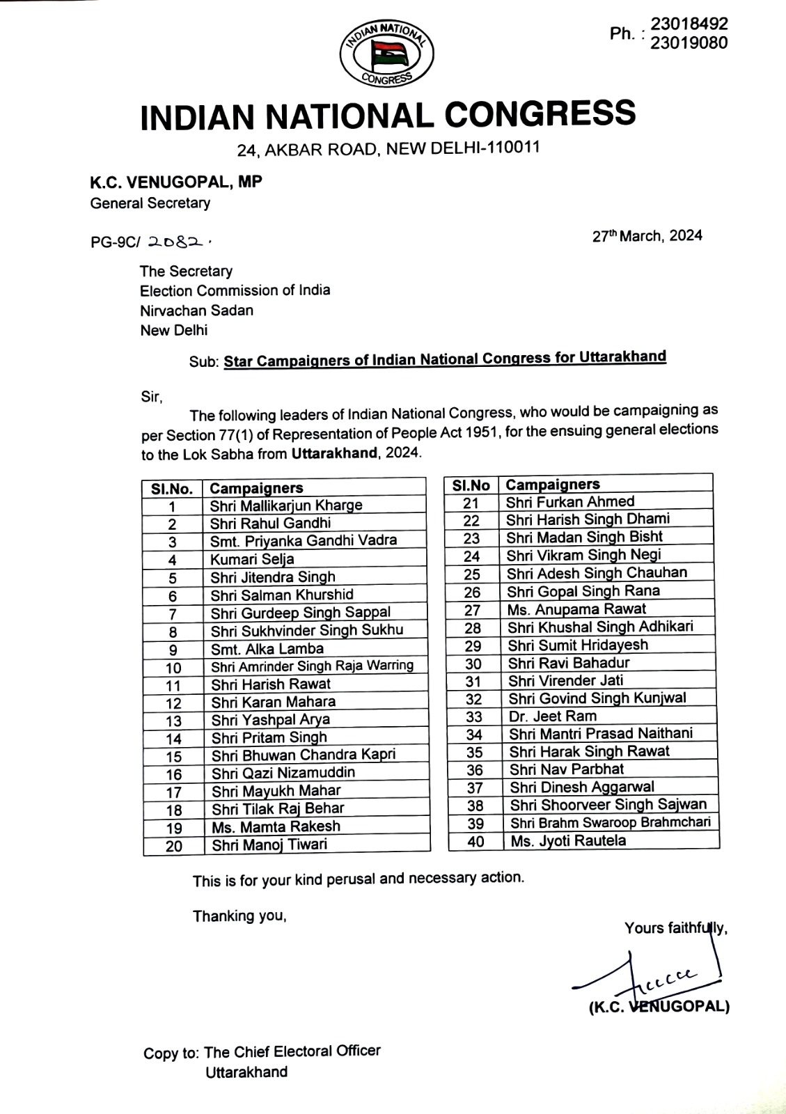कांग्रेस ने भी लोकसभा चुनाव को लेकर पार्टी के स्टार प्रचारकों की सूची जारी की है।