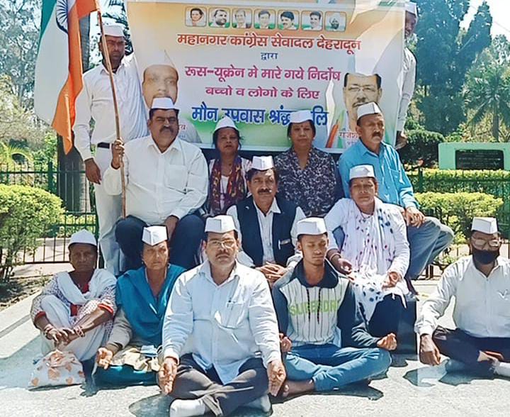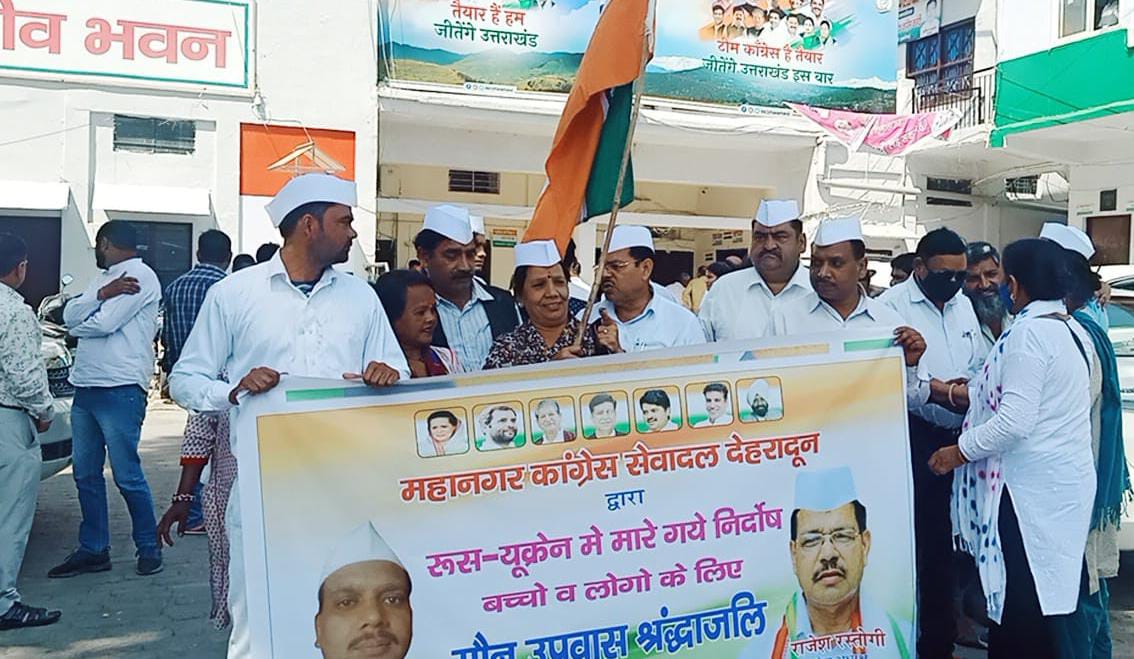 राष्ट्रीय तिरंगा यात्रा निकालकर महानगर कांग्रेस सेवादल के अध्यक्ष राजकुमार यादव की अध्यक्षता में महात्मा गांधी की प्रतिमा पर आधे घंटे का मौन उपवास रखकर रूस – यूक्रेन बीच चल रहे युद्ध में जान गवाने वालो मासूम बच्चों को श्रद्धांजलि दी तथा से भारत सरकार से तत्काल युद्ध विराम कराये जाने की मांग की है , आज प्रातः 11-15 पर पीसीसी से राष्ट्रीय तिरंगा यात्रा शुरू की गई।