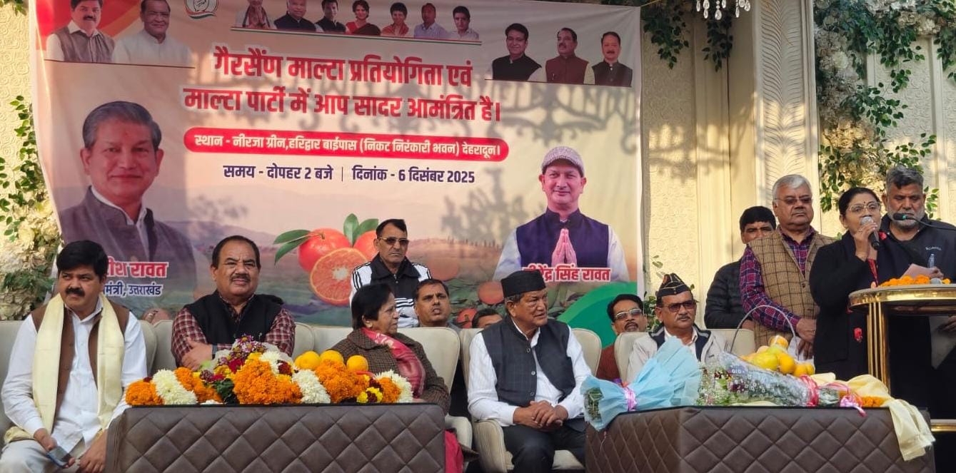 पूर्व मुख्यमंत्री हरीश रावत द्वारा आज देहरादून में माल्टे की खुशबूए पहाड़ की धड़कन मे शामिल हुए प्रदेश अध्यक्ष गणेश गोदियाल और ड़ा हरक सिंह ने भी लगाया तड़का के उपलक्ष्य में ष्गैरसैंण माल्टा प्रतियोगिताष्. नीरजा ग्रीन्सए हरिद्वार बाईपास रोड़ए जिला देहरादून ;निकटदृनिरंकारी भवनए कारगी चौकद्ध पर आयोजित किया गया। पूर्व मुख्यमंत्री हरीश रावत ने कहा कि मै अपने उत्तराखंडीयत को बढ़ाने के लिए अग्रसर हूँ आज मैंने माल्टा पार्टी का आयोजन इस लिए किया ताकि लोग गैरसैण महलचोरी व अन्य स्थानों के मालटे का स्वाद कही भूल ना जाये उन्होने उत्तराखंड के स्थानीय फलों व खाद्य पदार्थों के प्रोत्साहन में गडेरी के गुटकेए अमरूद कीवी और पकौड़ी के साथ सिलबट्टे की बनी हुई चटनी संग रामगढ़ और लोहाघाट के माल्टे आदि के स्वाद का लुफ्त विभिन्न सामाजिक सांस्कृतिक,राजनीतिक व ट्रेड़ यूनियन से जुड़े लोगो ने जमकर उठाया।