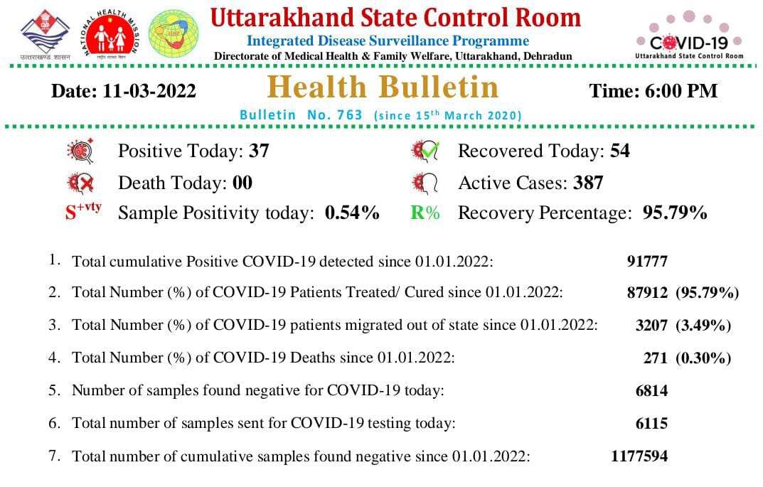 उत्तराखण्ड राज्य में एक्टिव मरीजों की संख्या 387 रह गई है रिकवरी दर 95 प्रतिशत के पार पहुंची इस साल अब तक 91777 मरीज आ चुके हैं सामने उत्तराखंड में शुक्रवार को कोरोना के 37 नए मरीज मिले जबकि किसी भी संक्रमित की मौत नहीं हुई। इसके साथ ही तीसरी लहर में राज्य में कोरोना के कुल मरीजों की संख्या 91 हजार 777 हो गई है।