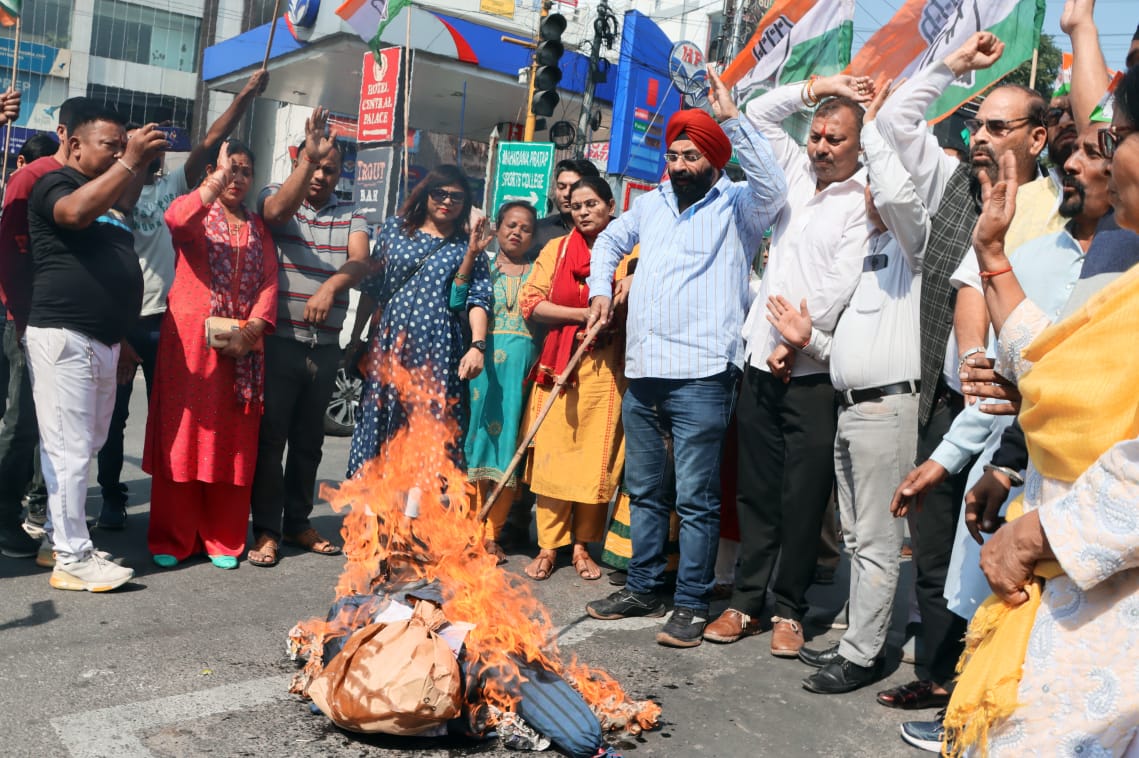 पूर्व निर्धारित कार्यक्रम के तहत महानगर कांग्रेसजन प्रदेश कार्यालय में एकत्र हुए जहां से महानगर कार्यकारी अध्यक्ष डाॅ0 जसविन्दर सिंह गोगी के नेतृत्व में भाजपा महामंत्री के खिलाफ नारेबाजी करते हुए ऐस्लेहाॅल चैक की ओर गये जहां पर उन्होंने भाजपा के राष्ट्रीय महामंत्री दुष्यन्त गौतम का पुतला दहन किया।