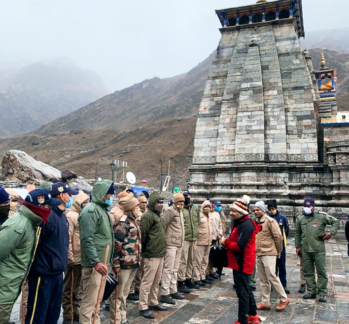 श्री केदारनाथ धाम में पूजा अर्चना करने के उपरांत डयूटी पर नियुक्त समस्त पुलिस बल (जिला पुलिस, एसडीआरएफ, पीएसी, होमगार्ड, पीआरडी) से रूबरू हुए तथा उपस्थित पुलिस बल को ब्रीफ किया ।
