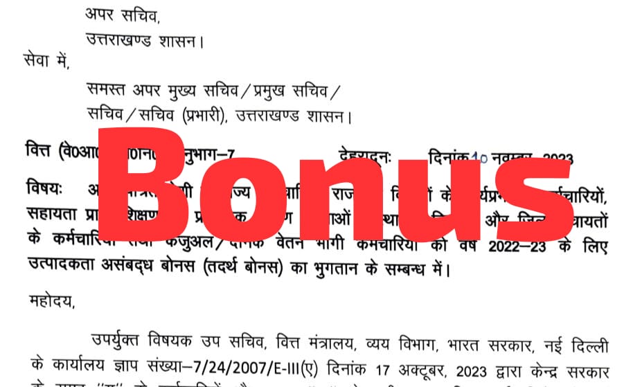 उपर्युक्त विषयक उप सचिव वित्त मंत्रालय, व्यय विभाग, भारत सरकार, नई दिल्ली के कार्यालय ज्ञाप संख्या-7/24/2007/E-III (ए) दिनांक 17 अक्टूबर 2023 द्वारा केन्द्र सरकार के समूह “ग” के कर्मचारियों और समूह “ख” के सभी अराजपत्रित कर्मचारियों को वर्ष 2022-23 के लिए 30 दिन की परिलब्धियों के बराबर (अधिकतम धनराशि रू0 7000/- (रू० सात हजार मात्र)) की सीमा निर्धारित करते हुए तदर्थ बोनस स्वीकृत किया गया है।
