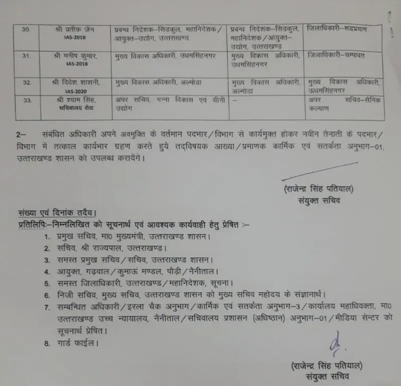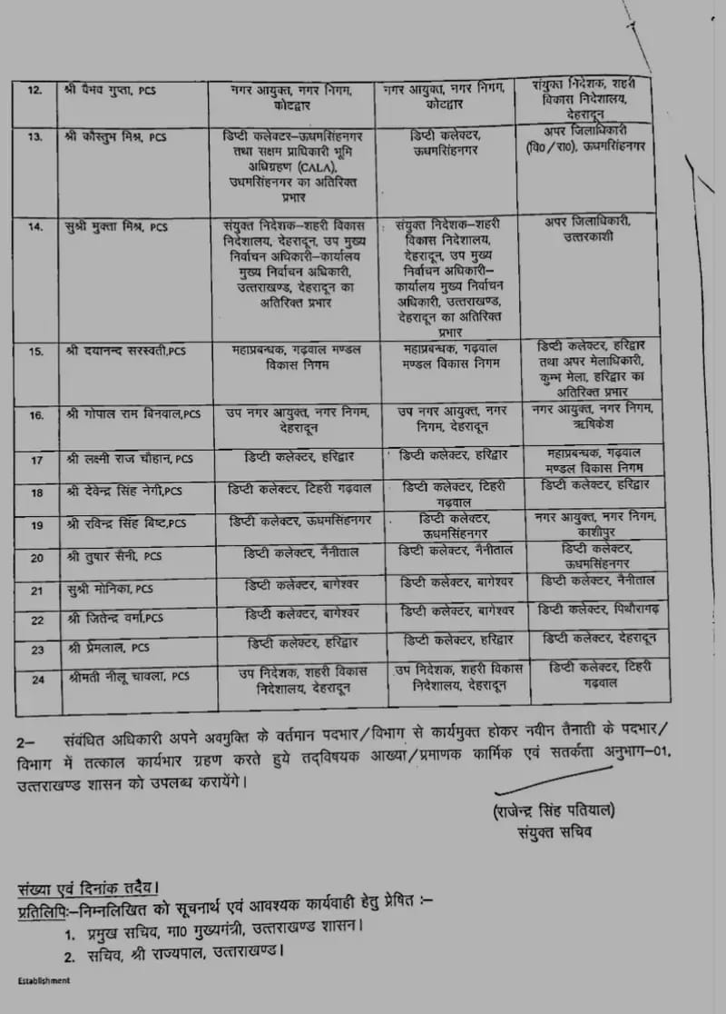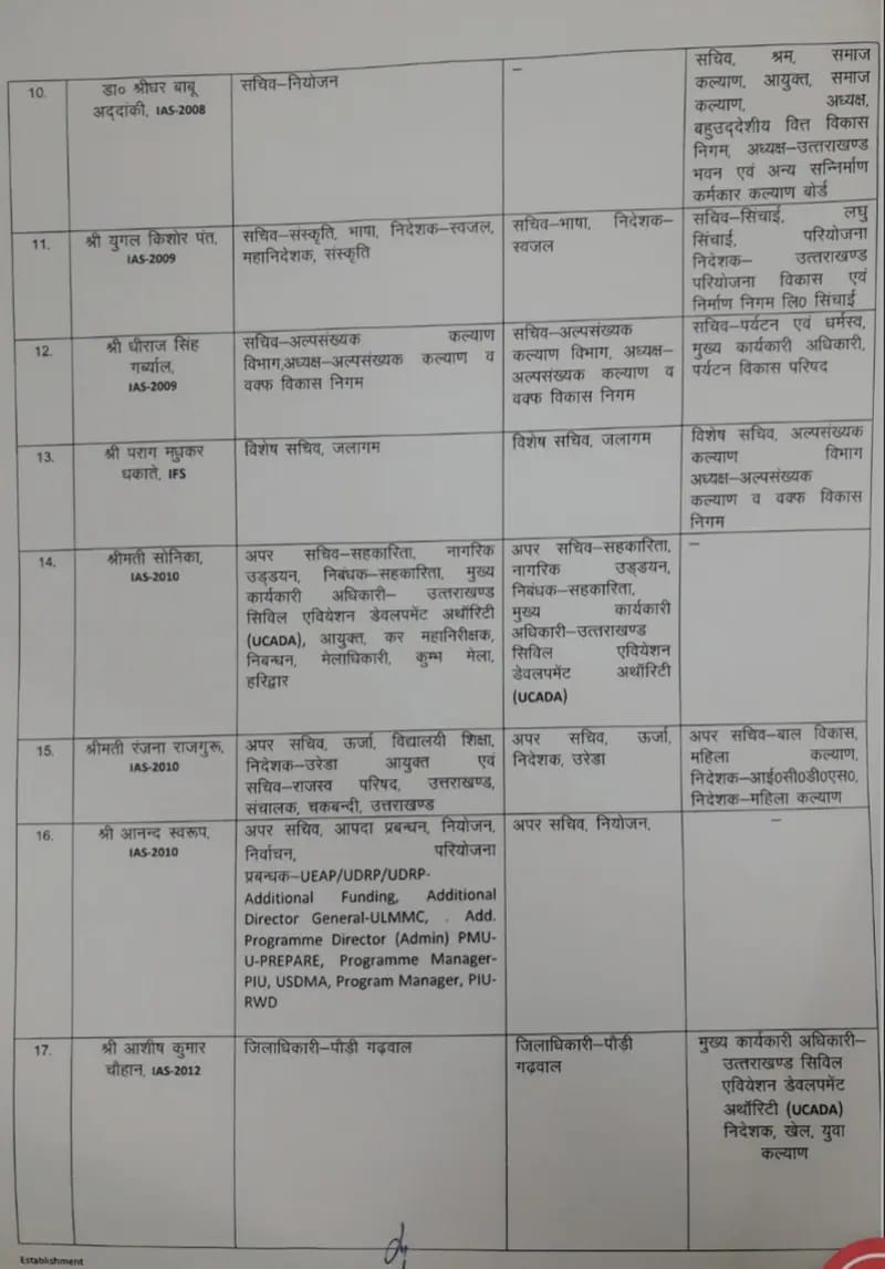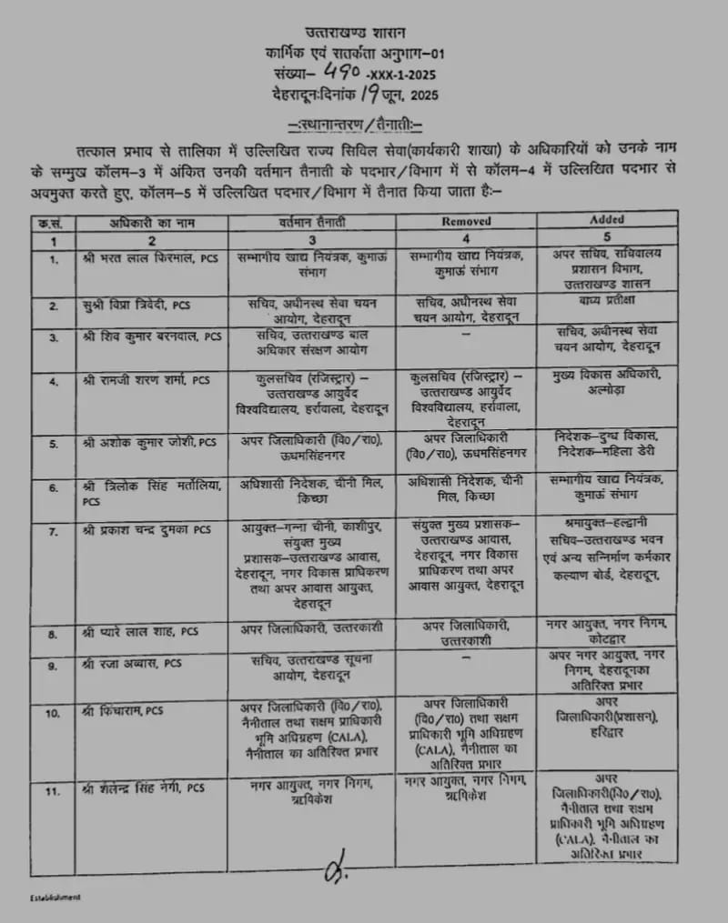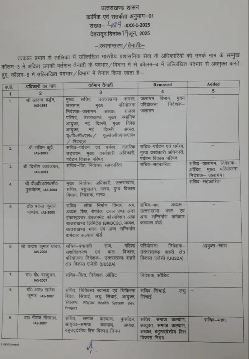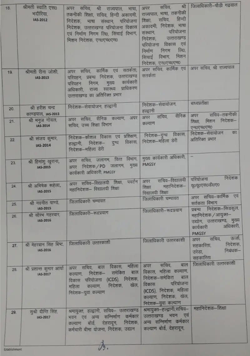 सभी अधिकारियों को तत्काल प्रभाव से तालिका में उल्लिखित भारतीय प्रशासनिक सेवा के अधिकारियों को उनके नाम के सम्मुख कॉलम-3 में अंकित उनकी वर्तमान तैनाती के पदभार/विभाग में से कॉलम 4 में उल्लिखित पदभार से अवमुक्त करते हुए, कॉलम-5 में उल्लिखित पदभार / विभाग में तैनात किया जाता है…