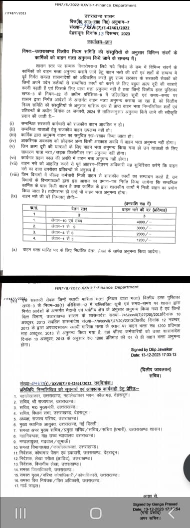 उत्तराखण्ड वित्तीय नियम समिति की संस्तुतियों के अनुसार विभिन्न संवर्ग के कार्मिकों को वाहन भत्ता अनुमन्य किये जाने के सम्बन्ध में सचिव दिलीप जावलकर की ओर से आदेश जारी किए गए हैं।