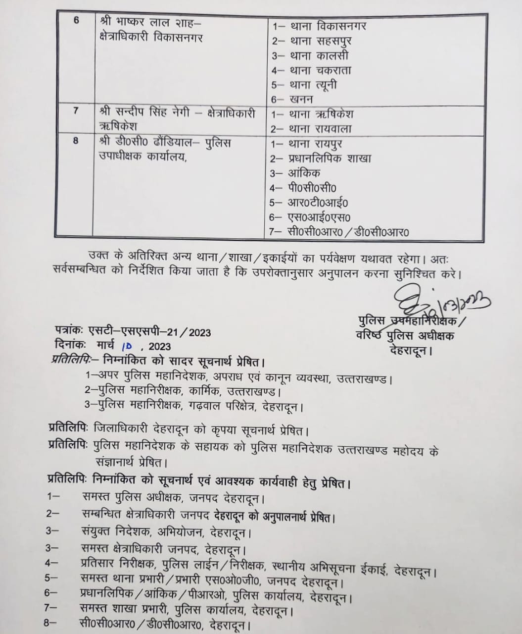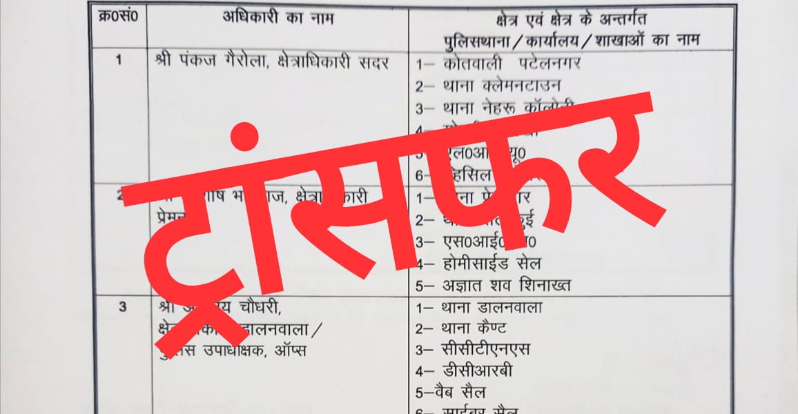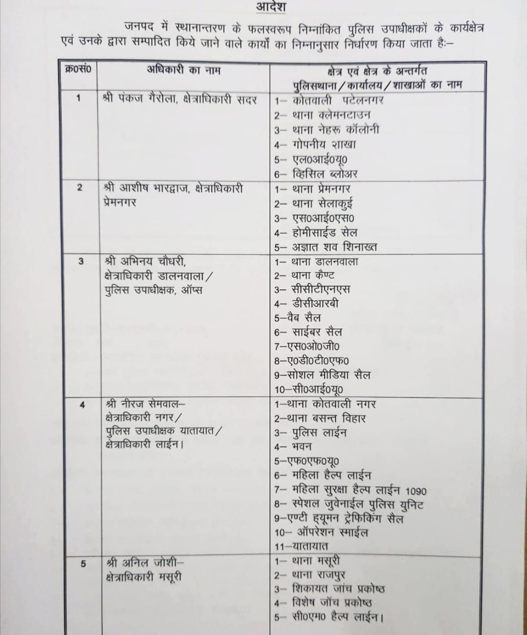 DIG/SSP दिलीप कुंवर ने किए क्षेत्राधीकारियों के स्थानांतरण,भास्कर लाल की जगह रहेंगे सदर के सीओ पंकज गैरोला,तत्काल प्रभाव से ज्वाइनिंग करने के निर्देश जारी..