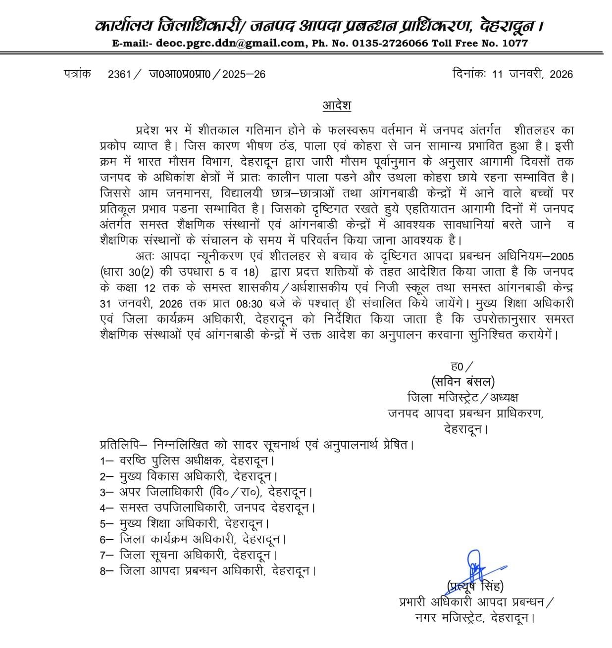 अतः आपदा न्यूनीकरण एवं शीतलहर से बचाव के दृष्टिगत आपदा प्रबन्धन अधिनियम-2005 (धारा 30 (2) की उपधारा 5 व 18) द्वारा प्रदत्त शक्तियों के तहत आदेशित किया जाता है कि जनपद के *कक्षा 12 तक के समस्त शासकीय/अर्धशासकीय एवं निजी स्कूल तथा समस्त आंगनबाडी केन्द्र 31 जनवरी, 2026 तक प्रात 08:30 बजे के पश्चात् ही संचालित किये जायेंगे*
