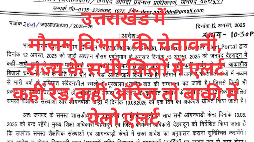 उपरोक्त विषयक अवगत कराना है कि निदेशक, भारत मौसम विज्ञान विभाग, देहरादून के द्वारा दिनांक 13.08.2025 को प्रातः 09:30 पर जारी पूर्वानुमान के अनुसार राज्य के जनपदों में दिनांकवार अलर्ट की सूचना निम्नवत् है…