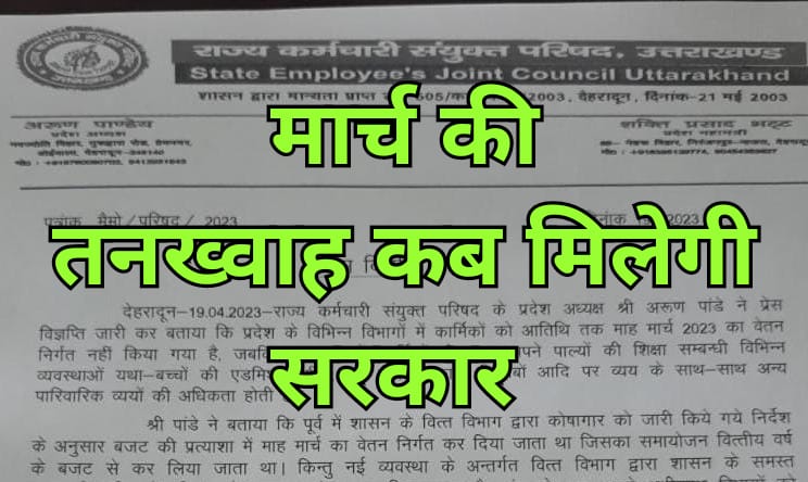 राज्य कर्मचारी संयुक्त परिषद के प्रदेश अध्यक्ष अरूण पांडे ने प्रेस विज्ञप्ति जारी कर बताया कि प्रदेश के विभिन्न विभागों में कार्मिकों को आतिथि तक माह मार्च 2023 का वेतन निर्गत नहीं किया गया है। जबकि इस माह में कार्मिकों के ऊपर अपने पाल्यों की शिक्षा सम्बन्धी विभिन्न व्यवस्थाओं यथा-बच्चों की एडमिशन फीस,ड्रेस व कापी किताबों आदि पर व्यय के साथ-साथ अन्य पारिवारिक व्ययों की अधिकता होती है।