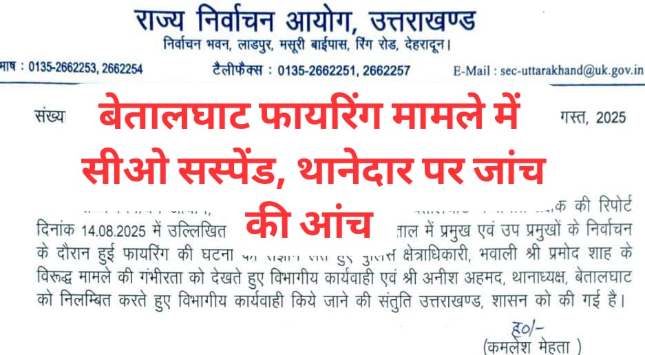 राज्य निर्वाचन आयोग, उत्तराखण्ड ने बेतालघाट (नैनीताल) में प्रमुख एवं उप प्रमुखों के निर्वाचन के दौरान हुई फायरिंग की गंभीर घटना का संज्ञान लिया है।
