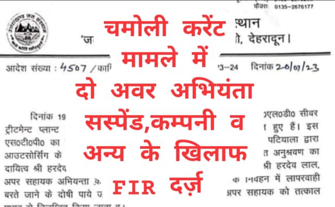 प् मुख्यमंत्री पुष्कर सिंह धामी के निर्देश पर चमोली हादसे के प्रकरण में मुख्य महाप्रबंधक उत्तराखण्ड जल संस्थान द्वारा एसटीपी का संचालन एवं रखरखाव करने वाली फर्म के कार्याे के समुचित अनुश्रवण का दायित्व देख रहे हरदेव लाल, अपर सहायक अभियन्ता को निलम्बित किया गया है।